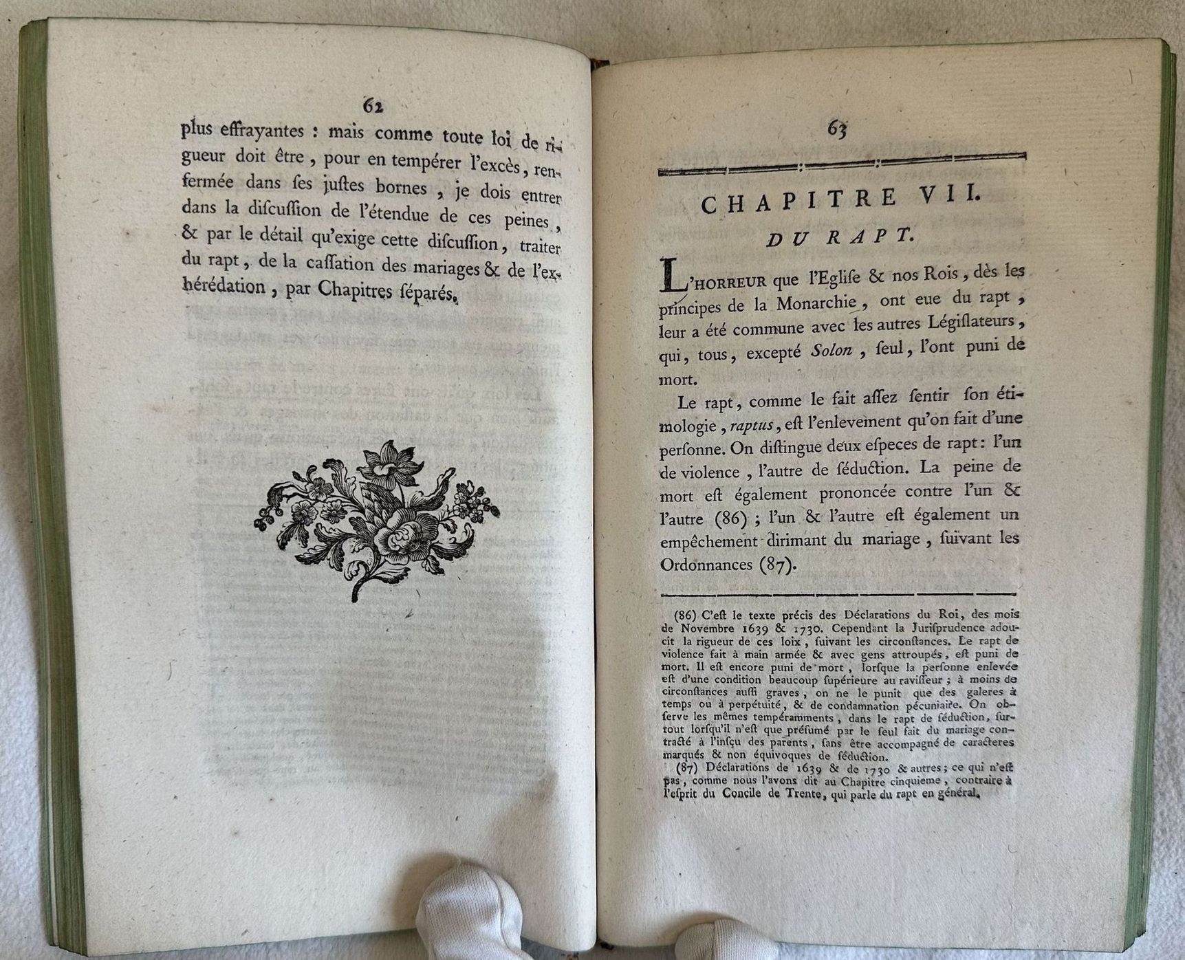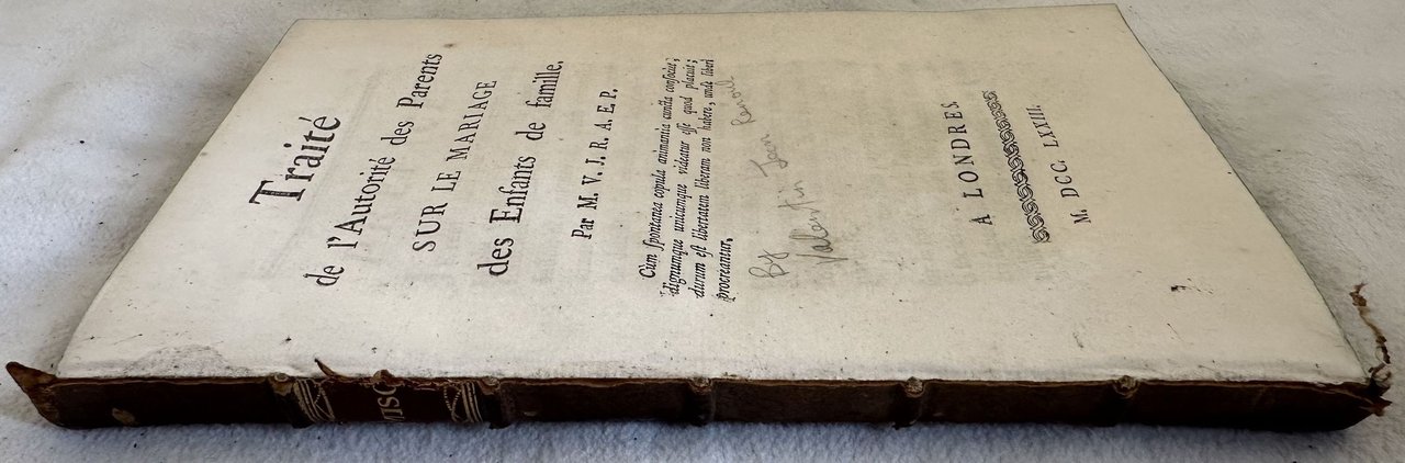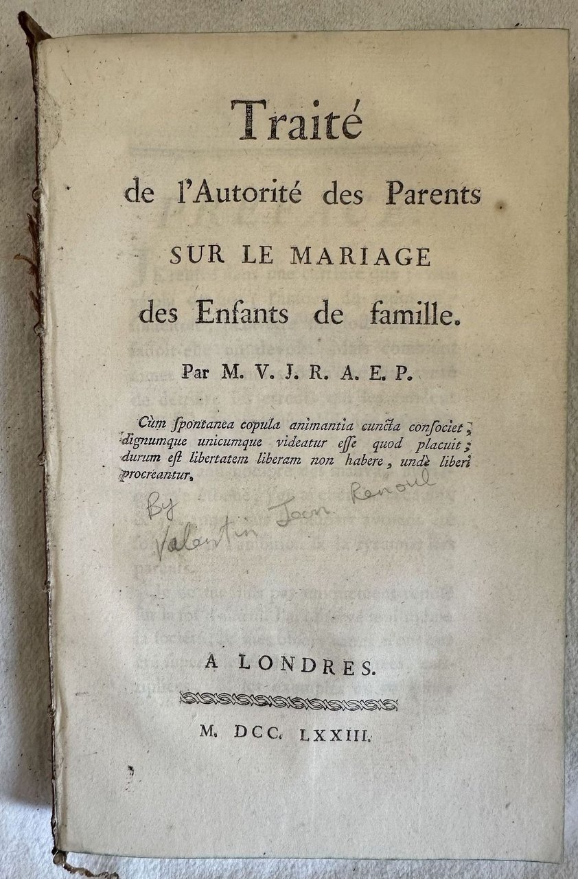 Rarissimo trattato sull'autorità dei genitori sul matrimonio dei figli.<BR> Autore anonimo ma Valentin Jean Renoul de Bas Champs. In buone condizioni. Copertina assente. Legatura in buone condizioni. All'interno le pagine si presentano in buone condizioni con rare fioriture. In 8. Dim. 20x12,5 cm. Pp. XIV+179+(1). Very scarce treaty about the authority of parents about the marriage of children. Anonymous authors but Valentin Jean Renoul de Bas Champs. In good conditions. Cover lacks. Binding in good conditions. Pages in good conditions with occasional foxing. In 8. Dim. 20x12,5 cm. Pp. XIV+179+(1).