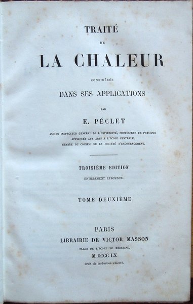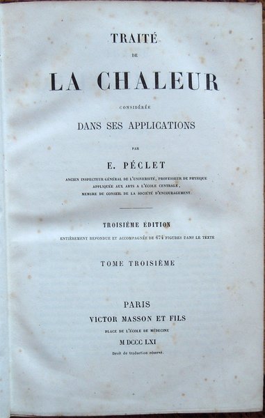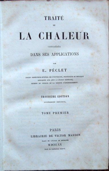 Traité de la chaleur considérée dans ses applications par E. Péclet . Troisième edition entièrement refondue. Tome premier [-troisième]