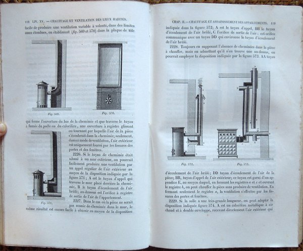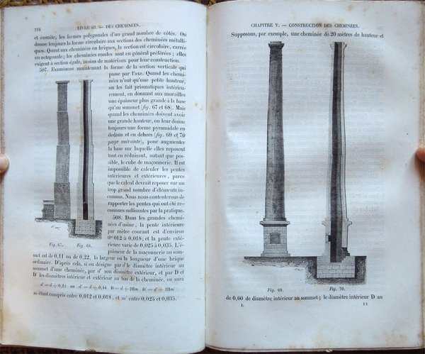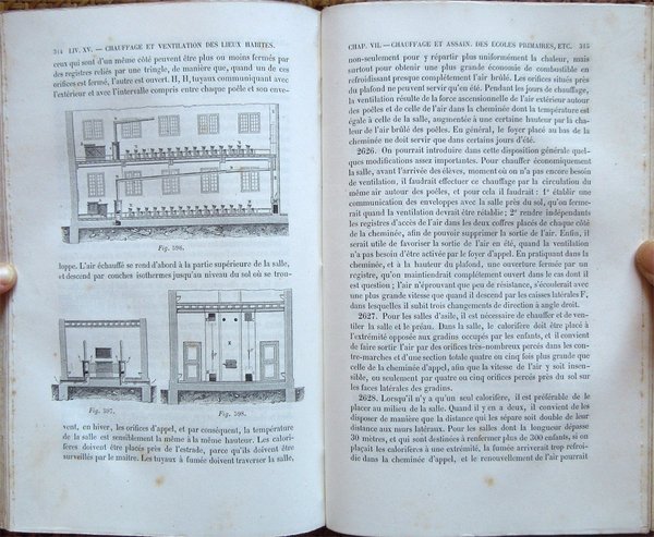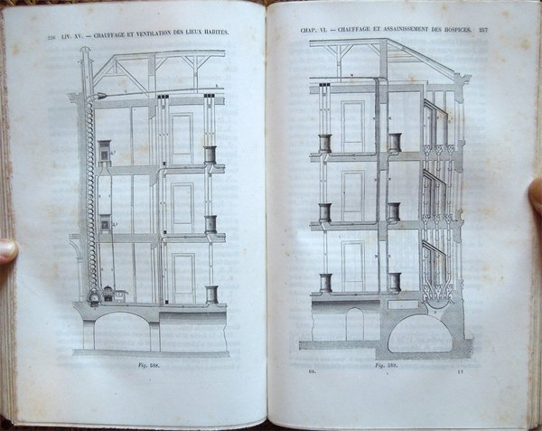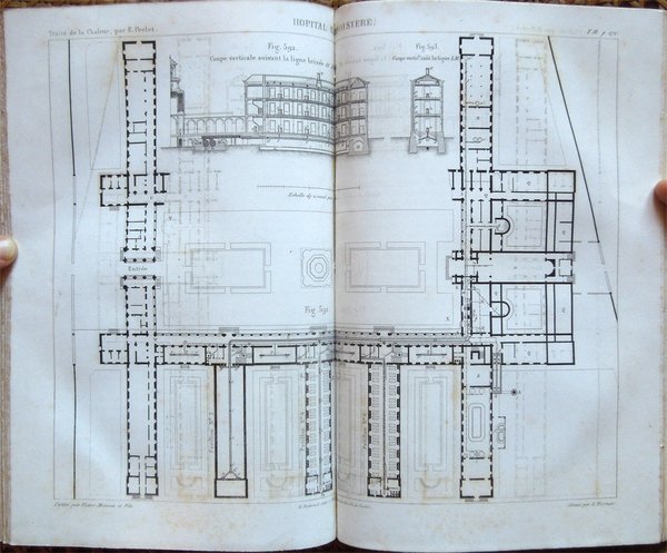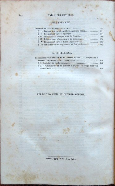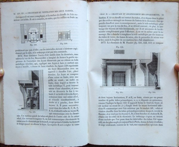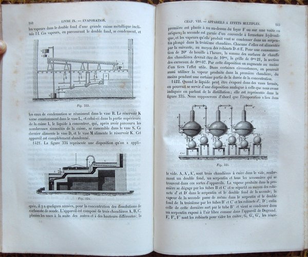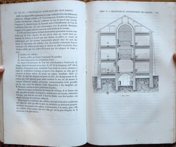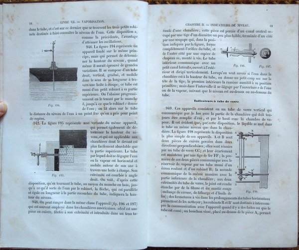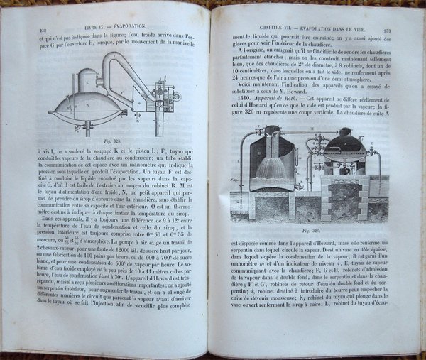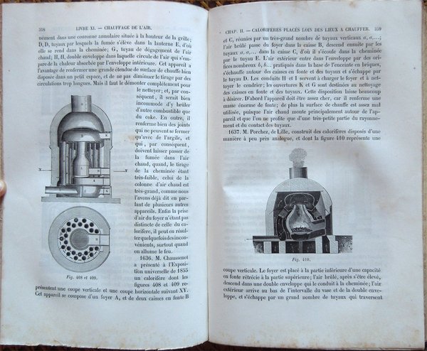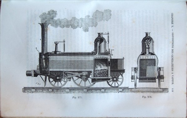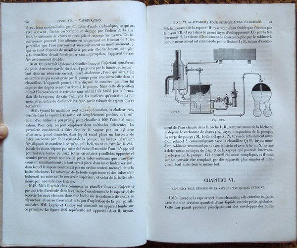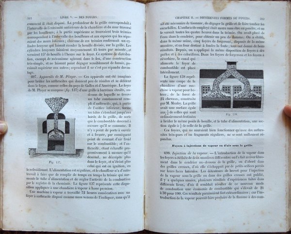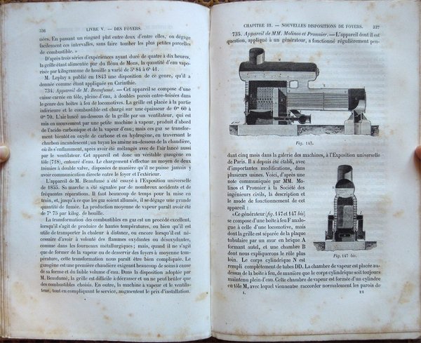 Tre volumi in-8° (23,6 x 14,8 cm), pp. (6), 476; (4), 500; (4), 484, legatura coeva in mezza tela, con titoli al dorso. Normali tracce d'uso e del tempo alla legatura. Con una tavola fuori testo, a doppia pagina, al terzo volume e, secondo quanto riportato nel frontespizio del terzo volume, 674 figure nel testo, in bianco e nero. Al primo volume, piccola mancanza, lontano dal testo, reintegrata con carta giapponese, nei fogli con le pagine dalla 165 alla 168 e 217-218, 243-244. Nel margine superiore di pagina 275, due operazioni matematiche scritte a inchiostro da mano coeva, prima della rilegatura del volume. A ciascun volume, timbro a secco di vecchio proprietario all'altezza dell'angolo superiore del foglio con al recto l'occhietto. Piccoli, leggeri segni d'umido ad alcune pagine. Per il resto, ben conservato. Table des matières. Premier volume. Livre premier. De la combustion et des combustibles. Chapitre I. De la combustion en général. Chapitre II. Des combustibles en général. Chapitre III. Des bois. Chapitre IV. Charbon de bois. Chapitre V. Tannée. Chapitre VI. Tourbe. Chapitre VII. Charbon de tourbe. Chapitre VIII. Combustibles fossiles. Chapitre IX. Du coke. Chapitre X. Détermination des volumes d'air nécessaires pour bruler les différents combustibles et des volumes de gaz qui s'échappent. Chapitre XI. Températures produites par la combustion des différents combustibles. Livre II. Écoulement des gaz comprimés. Chapitre I. Écoulement des gaz, sous des faibles pressions, par un orifice en mince paroi. Chapitre II. Écoulement des gaz, sous de grandes pressions, par un orifice en mince paroi. Chapitre III. Examen de la formule de M. Navier. Chapitre IV. Écoulement par des ajutages cylindriques et coniques. Chapitre V. Frottement dans les tuyaux de conduite de gaz. Chapitre VI. Changements de direction dans les tuyaux de conduite de gaz. Chapitre VII. Changements de section dans les tuyaux de conduite du gaz. Chapitre VIII. Écoulement des gaz par des tuyaux d'une forme quelconque. Chapitre IX. Écoulement de la vapeur sous différentes pressions. Chapitre X. Anémomètres et manomètres. Livre III. Des cheminées. Chapitre I. Mouvement de l'air chaud dans les tuyaux verticaux. Chapitre II. Considérations générales sur les cheminées d'usine. Chapitre III. Dimensions des cheminées d'usine. Chapitre IV. Cheminées d'appel. Chapitre V. Construction des cheminées. Chapitre VI. Influence de l'état de l'atmosphère sur le tirage des cheminées. Chapitre VII. Appareils destinés a soustraire le tirage des cheminées a l'influence des vents et de la pluie. Chapitre VIII. Appareils destinés a mesurer le tirage. Livre IV. Mouvements de l'air produits par des machines ou par des jets de vapeur. Chapitre I. Considérations générales sur les appareils ventilateurs. Chapitre II. Ventilateurs a force centrifuge. Chapitre III. Ventilateurs a vis. Chapitre IV. Roues pneumatiques. Chapitre V. Machines a piston. Chapitre VI. Machines a cloches plongeantes. Chapitre VII. Ventilation par jets de vapeur. Chapitre VIII. Machines soufflantes diverses. Chapitre IX. Ventilation par un travail accumulé. Livre V. Des foyers. Chapitre I. Des foyers ordinaires a flamme droite. Chapitre II. Différentes formes de foyers. Chapitre III. Nouvelles dispositions de foyers. Chapitre IV. Considérations générales sur les foyers. Chapitre V. Foyers pour les divers combustibles. Livre VI. Émission et transmission de la chaleur. Chapitre I. Émission de la chaleur par des surfaces maintenues a une température constante. Chapitre II. Transmission de la chaleur a travers les corps solides. Chapitre III. Considérations générales et applications des formules. Note. Tables et renseignements relatifs aux propriétés physiques des corps. Deuxième volume. Livre VII. Vaporisation. Chapitre I. Des générateurs de vapeur en général. Chapitre II. Indicateurs de niveau. Chapitre III. Manomètres et thermomètres. Chapitre IV. Soupapes de sureté et plaques fusibles. Chapitre V. Alimentation des chaudières a vapeur. Chapitre VI. Appareils pour séparer de la vapeur l'eau qu'elle entraine. Chapitre VII. Fourneaux. Chapitre VIII. Incrustations des chaudières et influence de certaines eaux d'alimentation. Chapitre IX. Conduite des chaudières a vapeur. Chapitre X. Dispositions diverses des générateurs a vapeur. Chapitre XI. Générateurs chauffés par la chaleur des gaz qui s'echappent de certains fourneaux. Chapitre XII. Explosions des chaudières a vapeur. Chapitre XIII. Améliorations a introduire dans les générateurs. Chapitre XIV. Phénomènes qui se produisent dans la transmission de la chaleur de la surface intérieure de la chaudière a l'eau. Livre VIII. Distillation. Chapitre I. Distillation simple. Chapitre II. Appareils de distillation a effets multiples. Chapitre III. Appareils de distillation et d'analyse de vapeurs. Livre IX. Évaporation. Chapitre I. Évaporation spontanée a l'air libre. Chapitre II. Évaporation a la température ordinaire par un courant d'air forcé. Chapitre III. Évaporation en bases ouverts par l'action directe d'un foyer. Chapitre IV. Évaporation d'un liquide chaud par un courant d'air forcé. Chapitre V. Évaporation directe par l'air brulé. Chapitre VI. Évaporation par la vapeur. Chapitre VII. Évaporation dans le vide. Chapitre VIII. Appareils d'évaporation dans lesquels la chaleur est employée plusieurs fois. Livre X. Séchage. Chapitre I. Extraction de l'eau par une action mécanique. Chapitre II. Séchage a l'air libre. Chapitre III. Séchage par un courant d'air forcé. Chapitre IV. Séchage par la chaleur. Chapitre V. Régulateurs de température. Chapitre VI. Dispositions des séchoirs a air chaud. Chapitre VII. Séchage du linge. Chapitre VIII. Dessiccation du bois et de la tourbe. Chapitre IX. Dessiccation des légumes. Chapitre X. Torréfaction du tabac a fumer. Chapitre XI. Séchage des étoffes par rayonnement. Chapitre XII. Séchage de