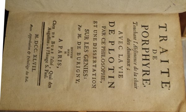 Traité de Porphyre, touchant l'abstinence de la chair des animaux; avec la Vie de Plotin par ce philosophe, et une dissertation sur les genies: par m. De Burigny