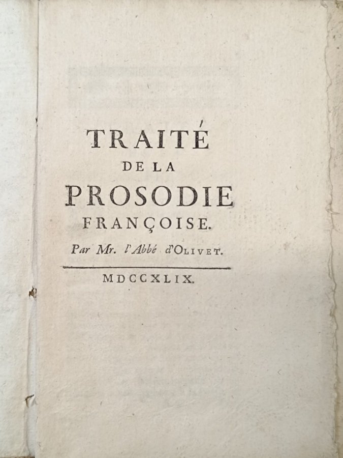 In-12° (cm. 17,8), legatura coeva in cartonato rigido muto (lievi tracce d'uso alle cerniere e alle cuffie); pp. 202 in barbe, in ottimo stato. Edizione non comune di questo trattato sulla prosodia francese, ossia la disciplina della quantità sillabica e in generale del ritmo poetico, caratteristica dell'antichità classica. In questa edizione non comune l'autore riduce il Trattato in 5 articoli: nel primo si chiariscono questioni preliminari, nel secondo gli accenti, nel terzo l'aspirazione, nel quarto la quantità e nell'ultimo a cosa può servire la conoscenza della prosodia. Testatine, capilettera e finalini silografici. Volume intonso. Esemplare molto buono. (NH7)