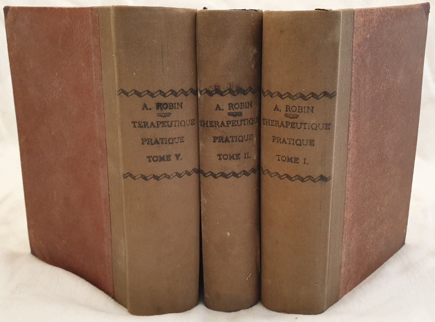 Edizione del 1912 di questo trattato di terapeutica pratica scritto da Albert Robin. Siamo purtroppo in possesso del tomo primo, secondo e quinto (malattie dell'apparato respiratorio, Apparato circolatorio, Sangue e organi ematopotetici, ghiandole vascolari sanguigne. Tomo II: Malattie dell'apparato digerente, peritoneo, fegato e pancreas, reni. Tomo V: Malattie del naso, larince, orecchie, occhi, denti, Apparati genitali, pelle, veneree ecc.). Alcune illustrazioni in bianco e nero all'interno. Testo francese. Insieme ai voumi alcuni appunti manoscritti del medico proprietario dell'opera. In discrete condizioni. Copertina in mezza tela con titolo al dorso in discrete condizioni con usure e parti mancanti ai margini e dorso. Legatura in buone condizioni. Pagine in buone condizioni con fioriture. In folio. Cm 25x18x8. Pp. 961, 936, 999. Peso Kg. 5,400. Edition of 1912 of this treaty of therapy written by Albert Robin. Unfortunately we only have the first, second and fifth tome (deseases of breathing, circulatory, blood. Tome II: Digestive deseases, liver, kidneys. Tomo V: Nose, ears, eyes, teeth, Genital system, skin, venerial deseases ecc.). Some black and white illustrations. French text. Together with the volumes some handwritten notes of the former owner physician of the work. In fair conditions. Half cloth cover with title in the spine in fair conditions with wearings and missing parts in the edges and spine. Binding in good conditions. Pages in good conditions with foxings. In folio. Cm 25x18x8. Pp. 961, 936, 999. Weight Kg. 5,400