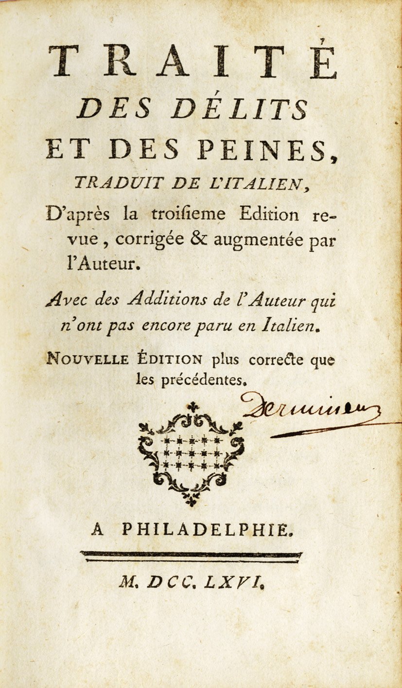 >in-12, pp. XL, 239. Leg. del tempo p. pelle con filetti a secco sui piatti, tit. e fregi oro al dorso, tagli rossi. Ristampa della prima edizione della traduzione francese col solo testo "Dei delitti e delle pene", pubblicatasi a Parigi col falso luogo di Losanna; anche la presente ediz. apparve a Parigi, ma col falso luogo di Filadelfia. Annunciata da D'Alembert sulla "Gazette littéraire de l'Europe" del 1^ agosto 1765 («...Ce bel ouvrage "Dei delitti e delle pene" méritoit d'être traduit dans notre langue par une main habile; un de nos meilleurs écrivains s'est chargé de ce soin; sa traduction est achevée et prête à paroître...»), essa apparve a Parigi il 28 dicembre di quell'anno 1765, ma con la falsa indicazione "à Lausanne 1766". Le correzioni ed aggiunte citate nel frontespizio, trasmesse al Morellet, erano state preparate dal Beccaria per la nuova edizione italiana (con l'indicazione "Edizione quinta", che uscirà a Livorno nel marzo del 1766). Bell'esempl. Firpo, Ediz. Opere di C. Beccaria I, pp. 294-5 (per l'ediz. orig. francese). Parenti, Luoghi falsi, p. 169.