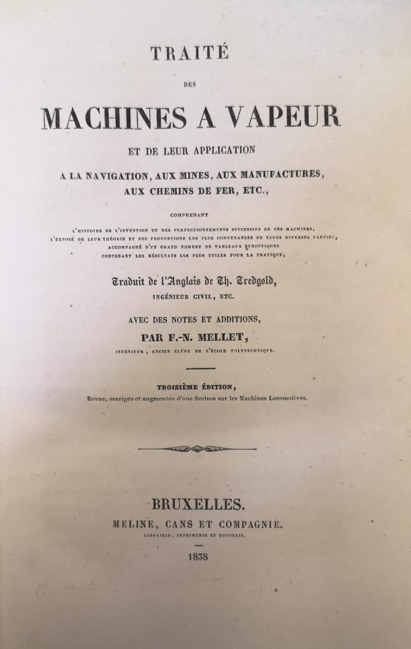 In-8 p. (mm. 215x135), mz. pelle coeva, fregi e titolo oro al dorso, tagli azzurri, pp. XXI,(3),553. L'opera comprende l'histoire de l'invention et des perfectionnements successifs de ces machines; l'exposé de leur théorie et des proportions les plus convenables de leurs diverses parties, accompagné d'un grand nombre de tableaux synoptiques contenant les résultats les plus utiles pour la pratique. Troisième édition, revue, corrigée et augmentée d'une Section sur les Machines Locomotives. Ben conservato.
