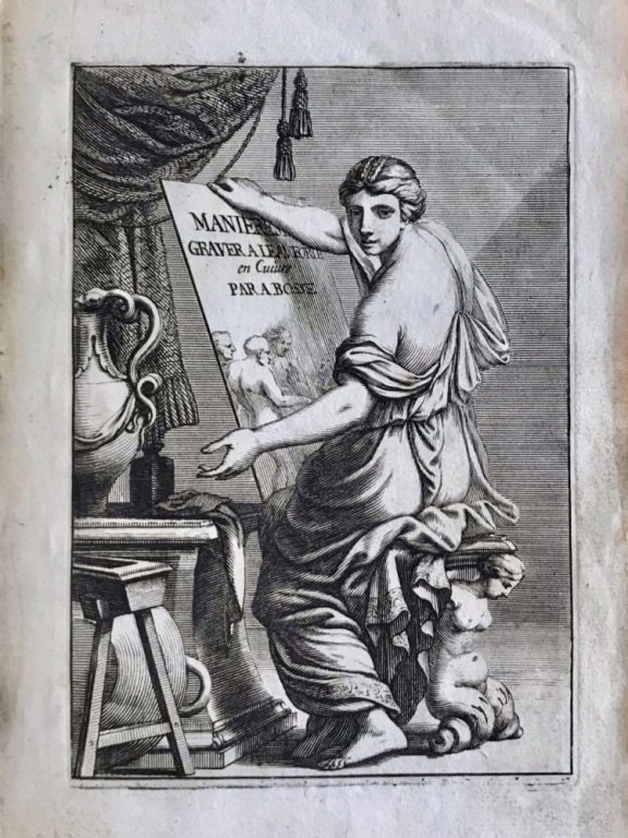 <span style="font-style: normal;">In-8° (cm. 18), legatura coeva in piena pelle con titolo in oro su tassello marocchino e decorazioni floreali in oro ai comparti del dorso; pp. [8] 70 [2] con 18 tavole illustrative in rame f.t. (1 tavola in antiporta f.t., 1 tavola f.t. firmata Franz Ertinger, 16 tavole numerate f.t. in fine); i dati tipografici al frontespizio sono coperti da un'antica etichetta a stampa applicata che recita invece </span><i>A Paris, chez Claude Jombert</i>, 1711. Primo manuale tecnico sull'arte dell'incisione con ricco apparato iconografico, apparso per la prima volta nel 1645 e qui con importanti aggiunte di Le Clerc. Cfr. Graesse I, 501. Esemplare molto buono. (SC2)