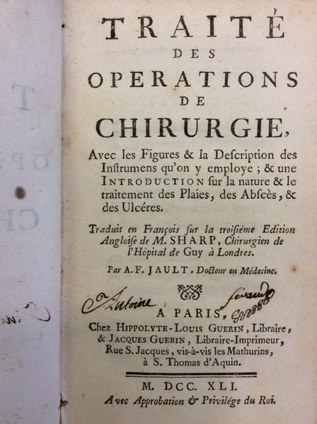 TRAITE DES OPERATIONS DE CHIRURGIE. - Avec les Figures & la Description des Instrumens qu'on y employe; & une Introduction sur la nature & le traitement des Plaies, des Abscès, & des Ulcères. Traduit en François sur la troisième édition Angloise de M. Sharp, ... par A. F. Jault.