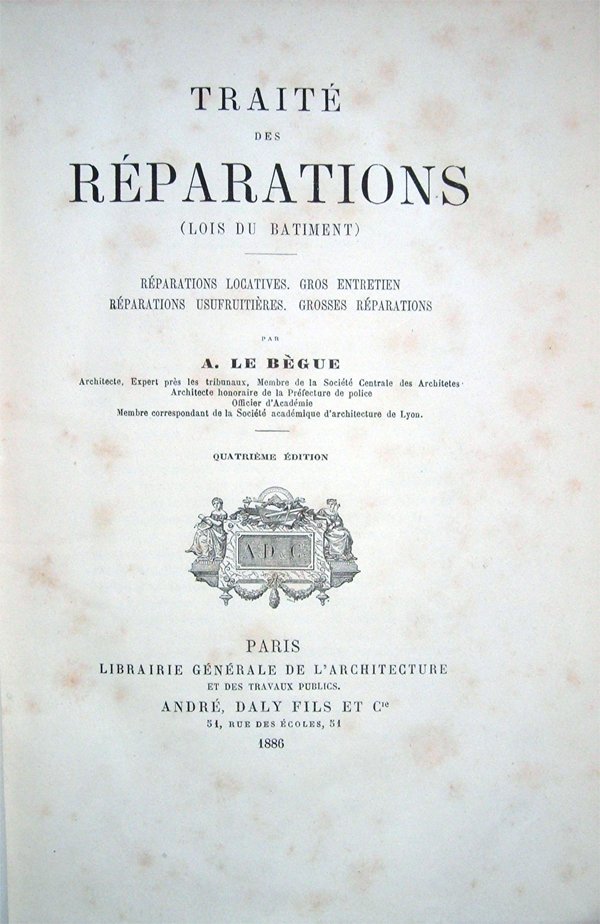 Due opere in un volume in-8°, pp. (2), 189, (3); 19, (3), legatura coeva in mezza tela rossa con titoli e fregio in oro al dorso. Leggere tracce d'umido alle prime pagine della prima opera. Leggere arrossature alle pagine della seconda opera, dovute al tipo di carta. Per il resto, buon esemplare. Table des matières: Traité des réparations (lois du batiment). Division de l'ouvrage. I. De l'entretien des édifices en général. Première partie. Réparations locatives. II. Réparations locatives, dites menu entretien. Gros entretien; III. Motifs pout lesquels le menu entretiena été mis à la charge des locataires; IV. Réparations locatives, avant la promulgation du Code civil; V. Idem; VI. Idem; VII. Idem; VIII. Idem; IX. Privilége du bailleur sur les meubles du preneur en faveur des réparations locatives. Explication du 3.e paragraphe de l'article 2102 du Code civil. Les matèriaux de démolition sout meubles; X. Si la chose louee est détruite pendant la derée du bail. Arrête de la Cour de cassation; XI. Réparations urgentes pendant la derée du bail; XII. Interdiction pour le bailler de faire des changements pendant la derée du bail; XIII. Délai accordé par l'usage pour déménager et faire les réparations locatives; XIV. Réparations locatives converties en indemnités. Utilité de convertir. Obligations en certains cas; XV. Lorsque le bail exige de la parte du preneur d'autres réparations que celles locatives. Bail à ferme; XVI. États de lieux: leur utilité. Deux sortes d'états de lieux; les frais qu'ils occasionnent; règles diverses; XVII. Lorsque le preneur cède son bail. Droit du propriétaire; entrente utile entre les deux locataires; XVIII. Réparations en cas d'incendie. Responsabilité du locataire; responsabilité du propriétaire. Arrête de la Cour de cassation; XIX. Compétence du juge de paix: limites de cette competence; XX. Explications par ordre alphabétique. Deuxième partie. Réparations usufruitières. XXI. Réparations usufruitières. Grosses réparations; XXII. Explication des articles 605 et 606 du Code civil; XXIII. Gros murs. Arrête de la Cour de cassation; XXIV. Voûtes; XXV. Rétablissement des poutres; XXVI. Couvertures entières; XXVII. Rétablissement des digues; XXVIII. Rétablissement des murs de soutènement; XXIX. Mars de clôture en entier. Questions.