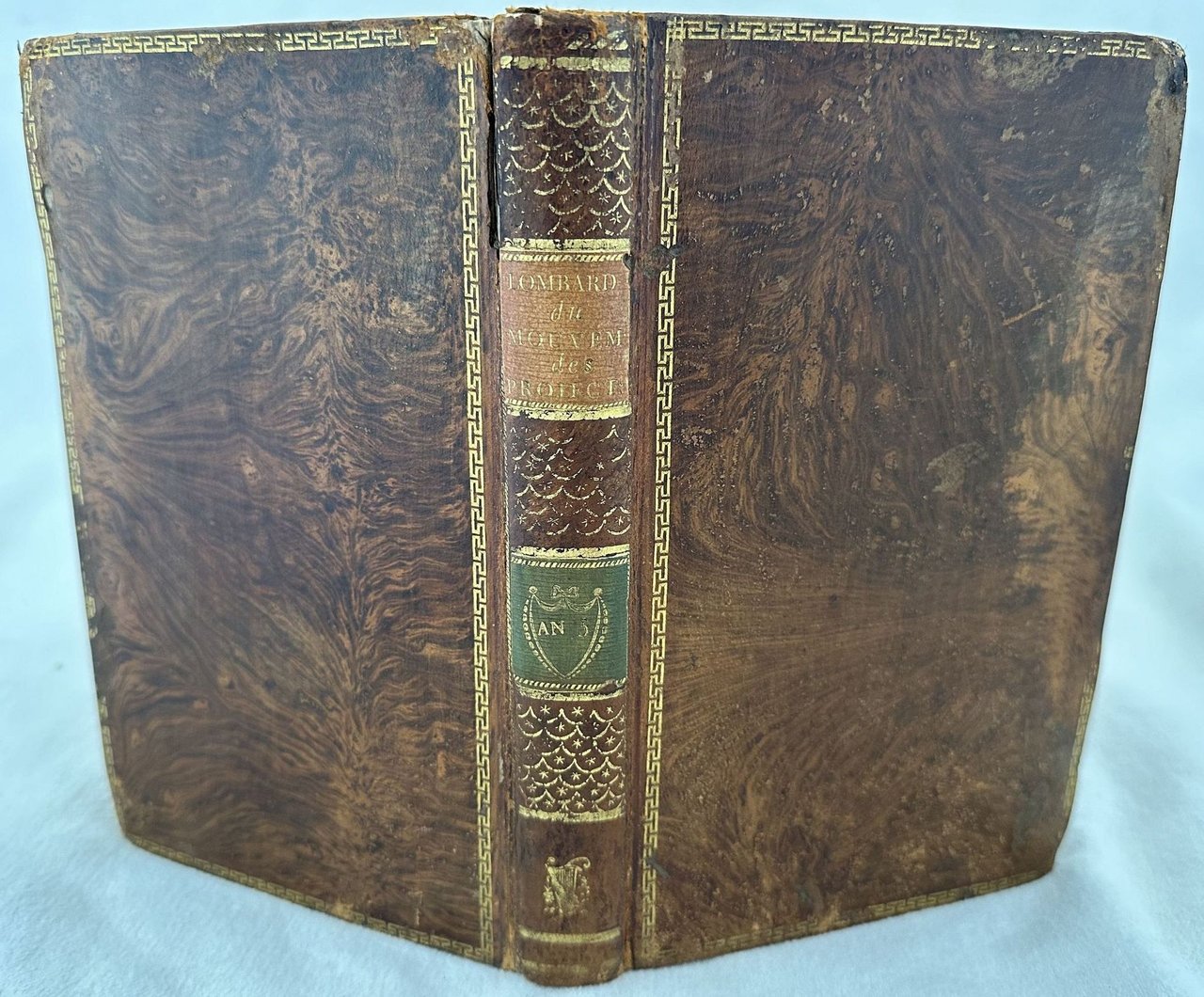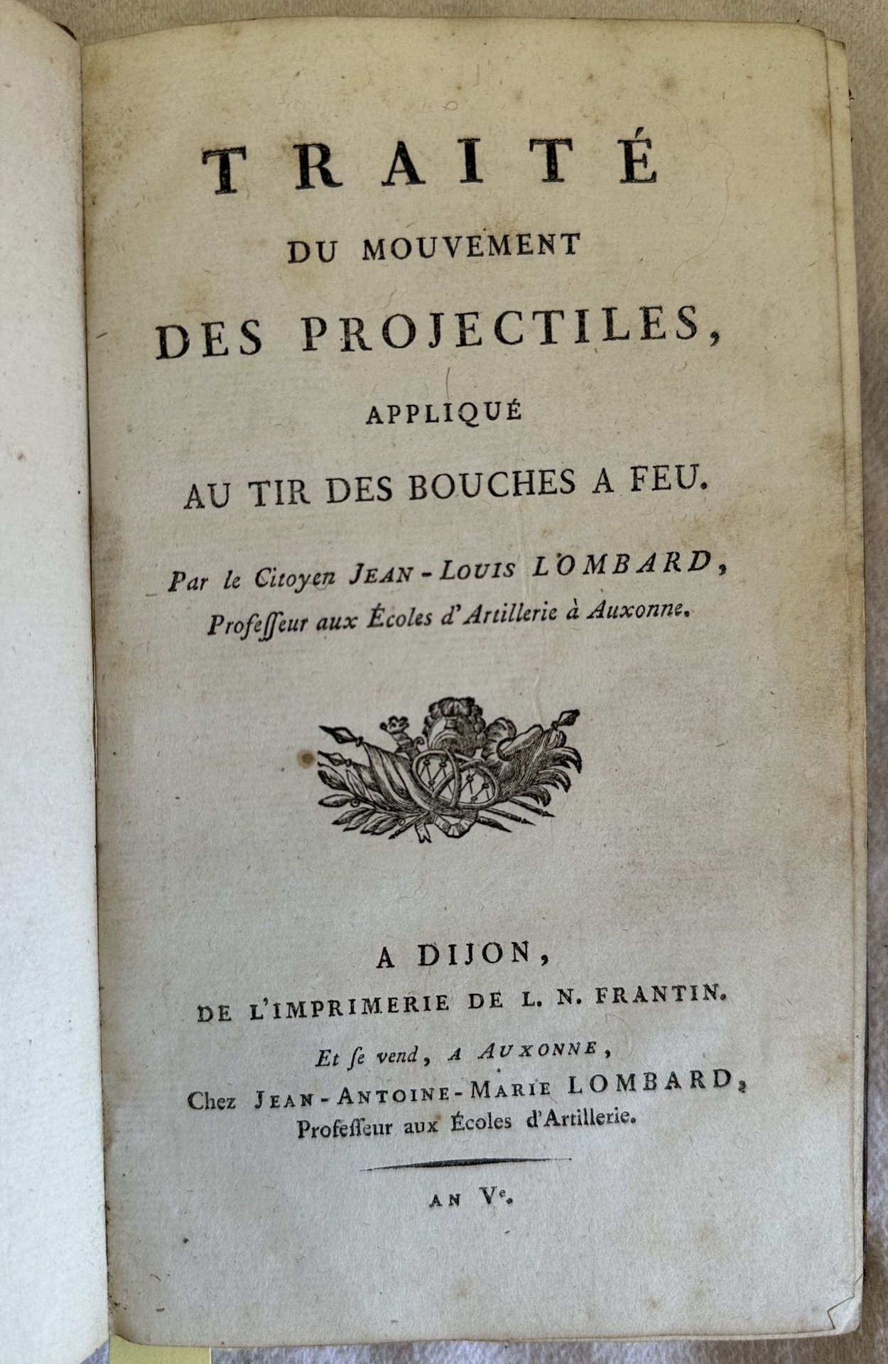 Prima edizione del 1797 di questo trattato di balistica scritto da Jean Louis Lombard (1723-1794). L'opera è uno studio sul movimento dei proiettoli applicato al tiro delle bocche da fuoco. L'autore, celebre professore di matematica e scrittore militare francese ebbe come allievo Napoleone Bonaparte. Nella prima parte principi di trigonometria, segue lo studio matematico di balistica. Alla fine del volume quattro tavole ripiegate. Rara opera. In ottime condizioni. Copertina in piena pelle con titolo e decorazioni in oro al dorso in ottime condizioni con lievi usure marginali. Legatura in buone condizioni. Pagine in ottime condizioni con rare fioriture. In 8. cm 19,5x12. Pp. (2)+XII+260+(6)+(1)+4 Pl.First edition of 1797 of this treaty of balistic written by Jean Louis Lombard (1723-1794). the work is a study about the movement of bullets on guns. The author, famous french teacher of mathematics and and writer of military had Napoleone Bonaparte as a student. In the first part principles of trigonometry, then the mathematical study of balistics. Four folded plates at the end of the volume. Scarce work. In very good conditions. Full leather coeval cover with gilted title and decorations in the spine in very good conditions lightly worn in the extremities. Binding in good conditions. Pages in very good conditions with occasional foxing.In 8. cm 19,5x12. Pp. (2)+XII+260+(6)+(1)+4 Pl.