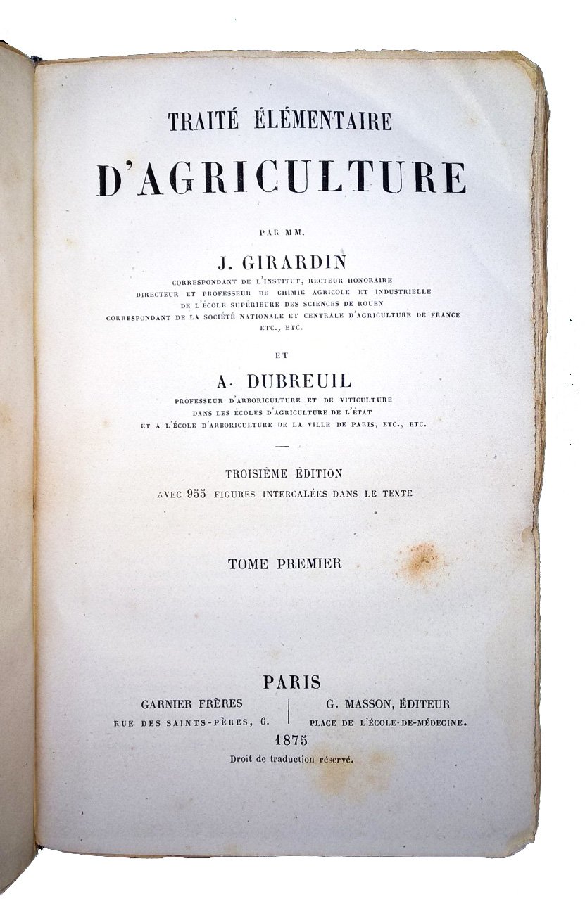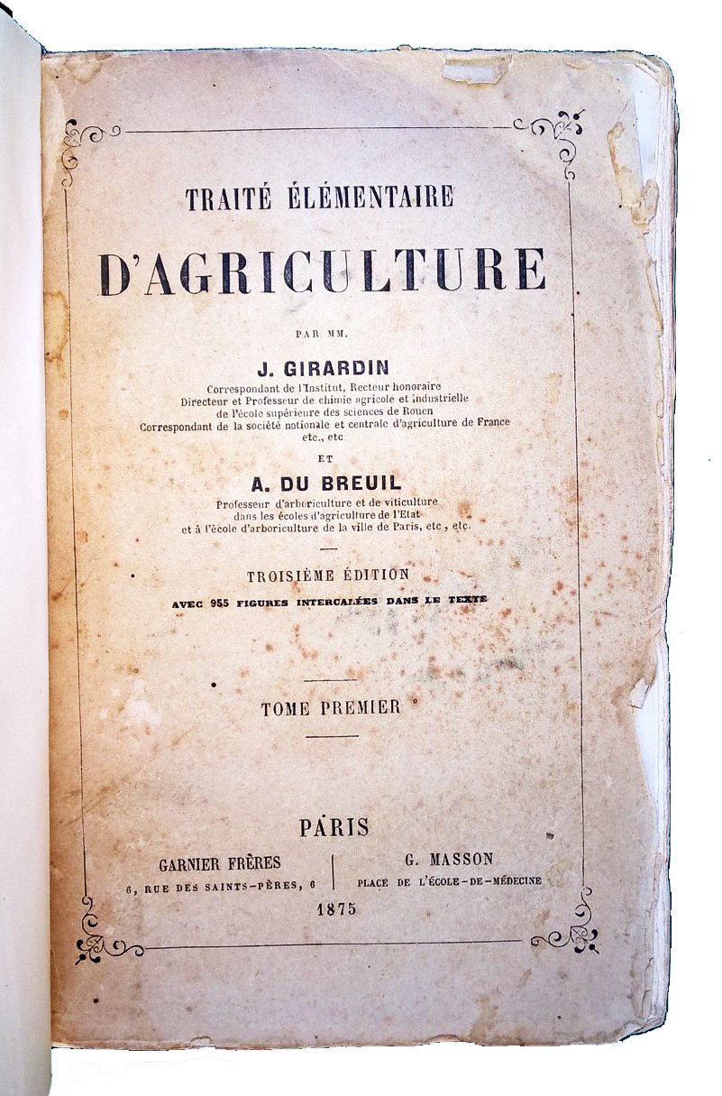 Traite elementaire d'agriculture par MM. J. Girardin […] et A. Du Breuil […]. Troiseme edition avec 955 figures intercalees dans le texte. Tome premier [-second].