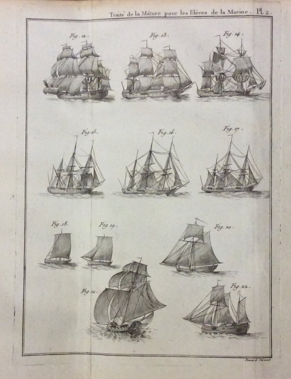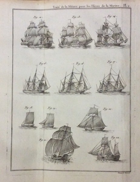 In-8 gr. (mm. 254x193), p. pelle bazana coeva, dorso a cordoni (abrasioni alle cerniere) con decoraz. e titolo oro su tassello, tagli rossi, pp. XL,294. E' introdotto da una interessante idée générale de la maneuvre des vaisseaux, de leurs évolutions et de leurs divers mouvements. In appendice Vocabulaire des termes qu'on a employés dans le Traité de la Mature e Indice delle figure. Il volume è molto ben illustrato da 192 figure in 24 tavole fuori testo, ripieg. e inc. in rame da Benard. Dans ce livre, qui jouit en son temps d'une réputation bien méritée, l'auteur envisage tout ce qui concerne la construction et la mature des vaisseaux et propose une nouvelle formule de voilure qui permet de tirer le meilleur parti possible du vent."Prima edizione" di questo importante trattato del francese Forfait (1752-1807), Ingénieur-Constructeur ordinaire de la Marine, grazie al quale venne eletto all'Accademia Reale delle Scienze.Lieve alone al margine super. di tutto il vol. ma certamente un buon esemplare.