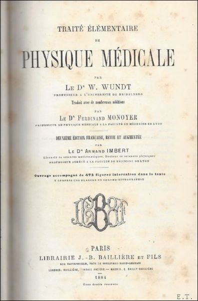 Relie, demi - maroquin brune, plats marbre, dos orne de fil. fleuronne dore et de piece de titre dore, plats de papier marbre, 16x24cm, 794pp, pages pique, illustre n/b. Traduits avec de nombreuses additions par Dr. Ferdinand Monoyer. Deuxieme editions francais, revue et augmente par Dr. Armand Imbert.Ouvrage accompagne de 427 figures intercalees dans le texte.