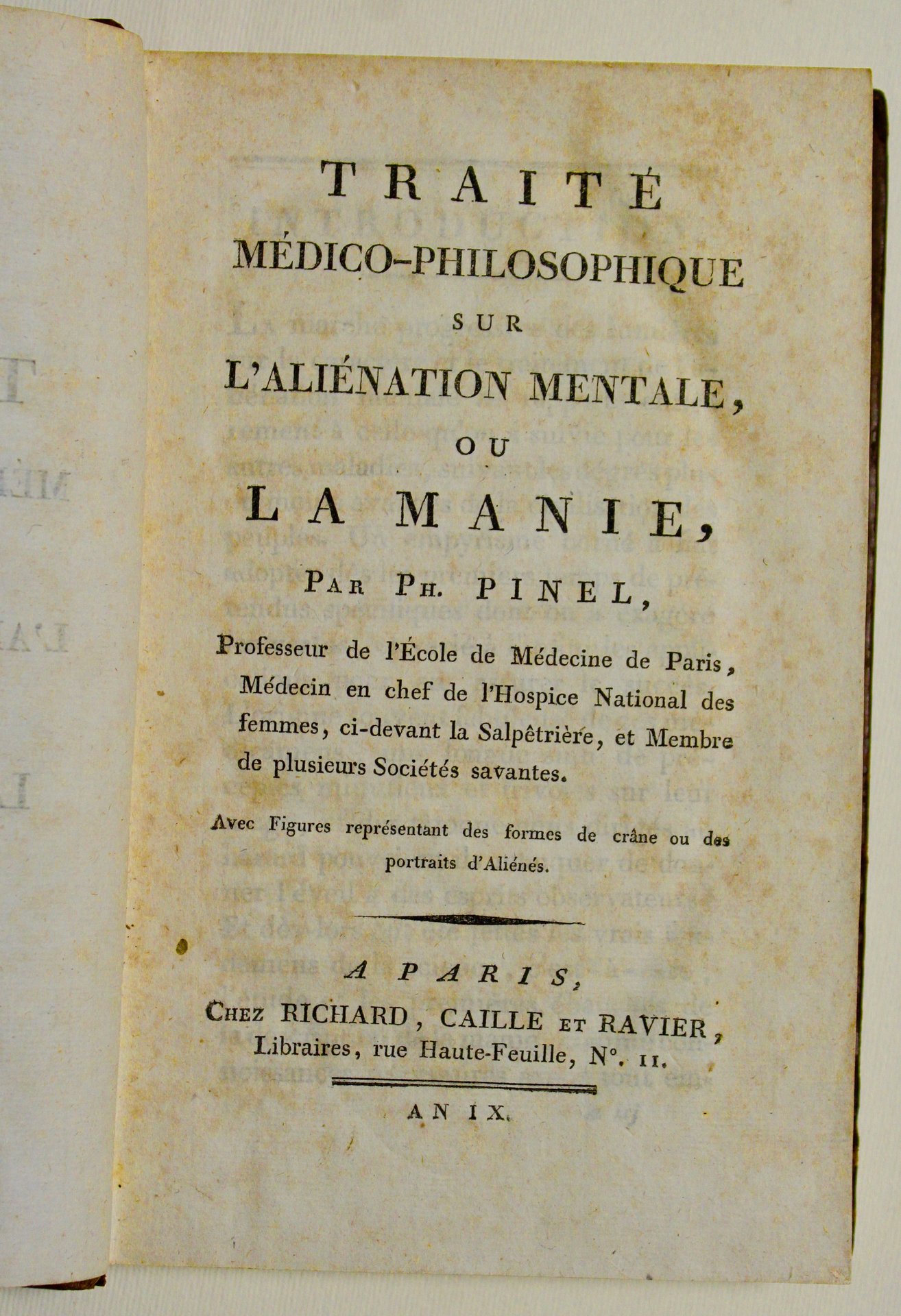 In 8° (mm 203x120); pagg. LVI, 318 con 2 tavole incise ed una tavola sinottica rip. Legatura coeva in piena pelle coeva, titolo su tassello in oro al dorso, fregi dorati.Edizione originale del testo fondamentale dell'iniziatore della moderna psichiatria, definito il padre della Scuola francese di psichiatria. Pinel (1745-1826) introdusse un trattamento "morale" delle malattie mentali, quello che oggi chiameremmo un approccio psicologico, in un periodo in cui catene, prigioni e pene corporali erano la norma per quanto riguarda i rimedi. "Pinel…located the origin of mental disease in pathological changes in the brain and gave impetus to the humanitarian treatment of the insane" (Heirs of Hippocrates, 1070). Norman: "In 1795 Pinel became chief physician at the Salpetrière, where he founded that institution's famous school of psichiatry. There he trained a generation of psichiatrist, the most important being Esquirol, who disseminated his ideas throught Europe".Bell'esemplare con lieve arrossamento generale della carta. Qualche escoriazione alla legatura.Garrison-Morton, 4922: "One of the foremost medical classics"; Norman, 100 famous book in medicine, 54; Waller, 7456.