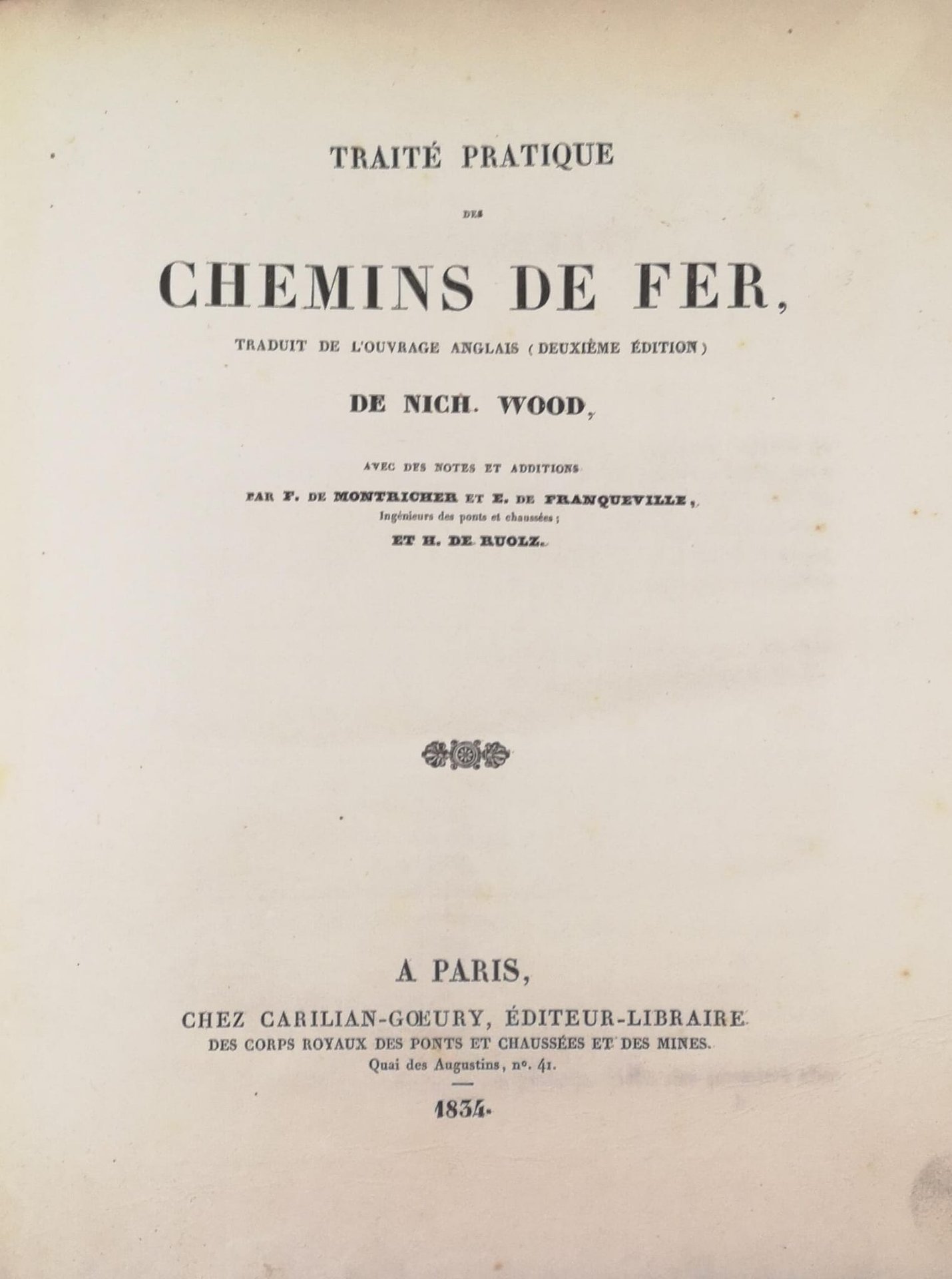 In-8 gr. (mm. 251x208), 2 volumi (testo + tavole) rileg. in 1 tomo, mezza pelle con angoli moderna (picc. spacco al dorso), cofanetto in mezza tela, pp. XII,306,(2); il secondo volume contiene 14 tavole a doppia pagina, ciascuna con numerose figg. di carattere tecnico, inc. in rame da Adam sui disegni di Montricher. Prima edizione francese eseguita sulla seconda inglese (Londra, 1832). L'A., Nicholas Wood (1795-1865) è stato un ingegnere inglese, la cui attività si svolse nel settore minerario - nel quale lavorava - e nello studio e sviluppo di locomotive a vapore. Ha contribuito a progettare molti progressi nell'ingegneria e nella sicurezza mineraria ed è stato determinante nella creazione dell'Istituto di ingegneri minerari e meccanici del Nord dell'Inghilterra, di cui è stato presidente dalla sua inaugurazione fino alla sua morte.Alc. fioriture intercalate nel testo, peraltro esemplare ben conservato.