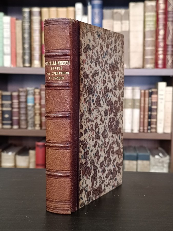 In-8° (cm. 21,6), legatura coeva in mezza pelle con titolo in oro al dorso a nervi, piatti e risguardi marmorizzati, tagli blu; pp. 598 in stato molto buono; lievi fioriture sparse, piccola asportazione all'angolo della prima carta bianca. Edizione non comune di questo trattato dell'economista francese <span style="font-size: 13.333333px;">Jean-Gustave </span>Courcelle-Seneuil, esponente della scuola liberale. Esemplare molto buono. (NA8)
