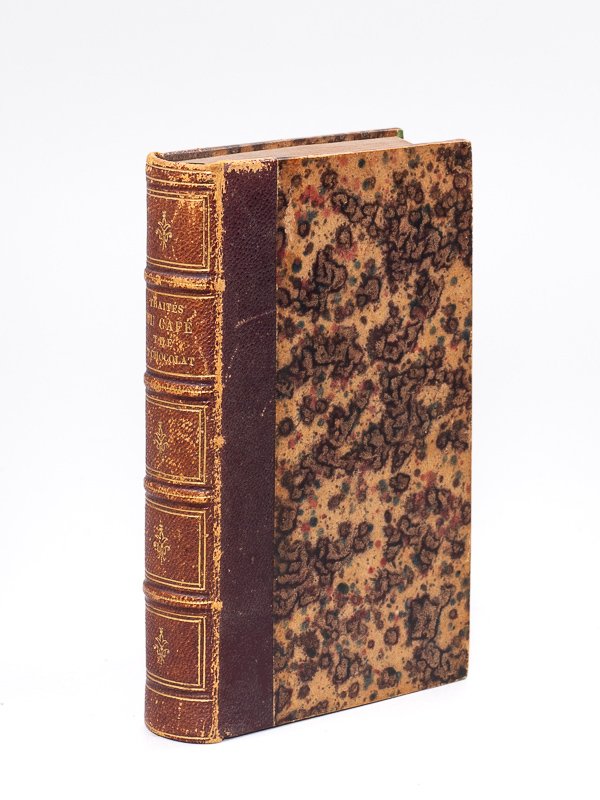 Seconde édition, 1 vol . in-12 reliure postérieure milieu XIXe dem-chagrin marron, dos à 4 nerfs, Chez Jean Baptiste Deville, Lyon, 1688, 11 ff. (frontispice, titre, Epistre, Avis au Public et Avis nécessaire), 444 pp., 2 ff. n. ch., et 1 f. manuscrit, avec 3 figures gravées dont 2 hors texte (la figure en frontispice du thé étant comprise dans la pagination) Seconde édition de cet ouvrage de référence pour l'histoire du café, du thé et du chocolat. Etat satisfaisant pour cet exemplaire incomplet des 3 derniers feuillets (dont la dernière page des tables, remplacées par une copie manuscrite du XIXe, et les 5 pages du Privilège), mais bien complet par ailleurs. Hormis le dos un peu frotté et qq. rousseurs, l'exemplaire est par ailleurs agréable et les gravures plus fraîches qu'à l'ordinaire (ex-libris gravés, l'un héraldique à trois merlettes de Joannis Francisci Rondé, l'autre de L. Gounelle). Vicaire, 293