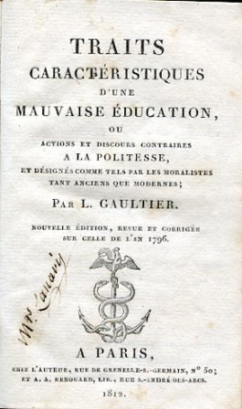 Traits caractéristiques d'une mauvaise éducation, ou actions et discours contraires a la politesse, et désignés comme tels par les moralistes tant anciens que modernes; nouvelle édition, revue et corrigée sur celle de l'an 1796