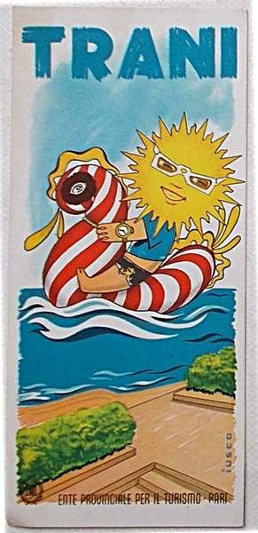Pieghevole di 6 facciate di cm. 21 x 9,5; con 1 piccola cartina e illustraz. fotograf. a colori. Bella ed originale copertina grafica a colori firmata "Iusco". VG.