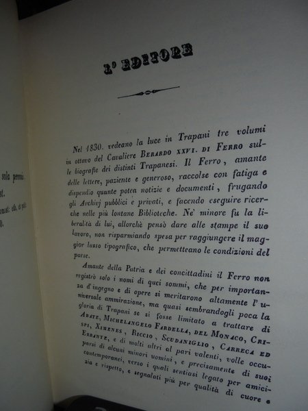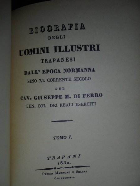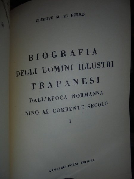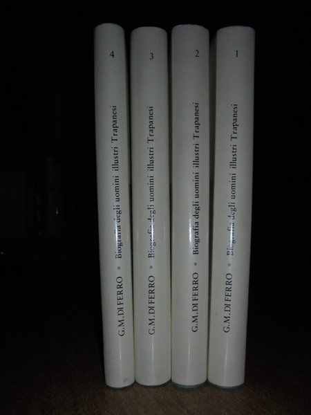 Giuseppe M. Di Ferro. Bologna, Arnaldo Forni Editore, 1973. Biografia degli uomini illustri trapanesi. Ristampa anastatica dell' edizione originale del 1830. 4 volumi in-8°, cartonato verde con titoli ai dorsi, sovracopertine illustrate. 276 pp.; 279 PP.; 274 pp.; 181 pp. Esemplare come nuovo. Neg. mob. nero