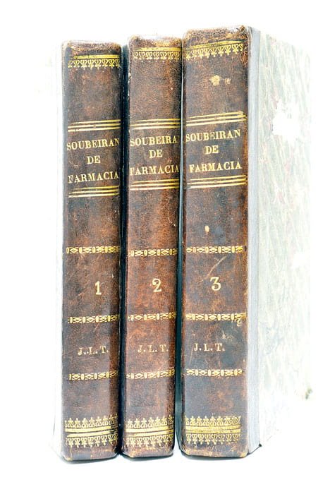 3 tomes en 3 volumes. 484 pages. + 388 pages. + 528 pages. Demi-veau, dos lisses ornés (reliure de l'époque). Coins et coiffes émoussés. Plats frottés. Edition Originale de la première traduction du manuel de pharmacie d'Eugène Soubeiran, le découvreur du chloroforme, par le chimiste galicien Antonio Casares Rodríguez. Auteur de travaux sur les eaux thermales espagnoles et les vins galiciens, cette traduction est intéressante parce que Casares Rodríguez introduisit l'usage du chloroforme en Galice. Il réalisa la présente traduction, qui fut délivrée à Madrid et à Lima, à partir de la troisième édition du traité de Soubeiran. Elle est illustrée de plusieurs gravures sur bois in-texte représentant des instruments de pharmacie. Ex-libris sur un feuillet de garde: "José Lopez Tapia, farmacéutico en la Lerna, 1882". Rousseurs.