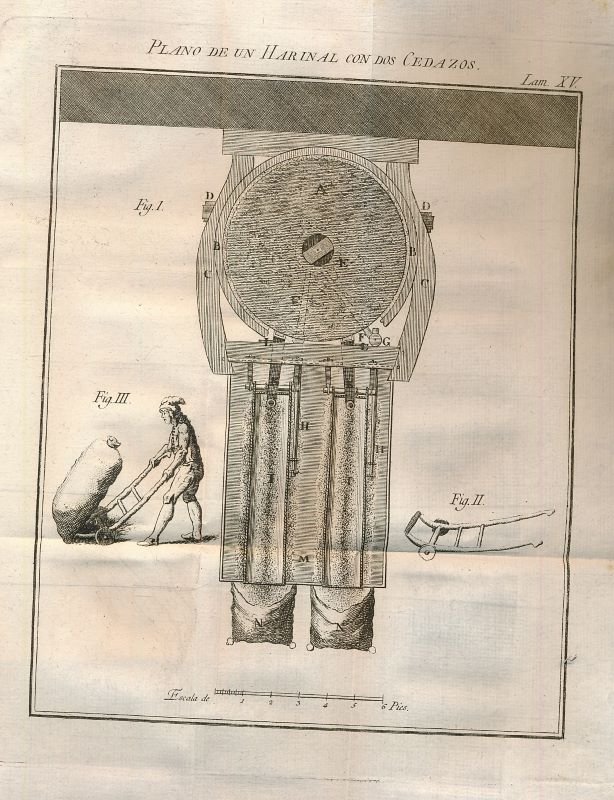 En la Imprenta de Benito Cano 1786 Madrid, En la Imprenta de Benito Cano, 1786. In-8 relié pleine basane de l'époque, dos lisse à faux nerfs, pièce de titre de matroquin rouge. Filet doré sur les plats. Faux-titre, titre, 4 feuillets non chiffrés, 571 pages, tableaux et 23 planches dépliantes en fin. Ecrito en Frances por Mr. Beguillet Abogado del Parlamento de Paris : Extractado y traducido al Castellano con algunas notas y un supplemento Por Don Felipe Marescalchi. L'édition française date de 1773, imprimée à Dijon sous le titre "Traité de la connaissance générale des grains et de la mouture par économie". Exemplaire bien complet et en bon état. Peu courant.