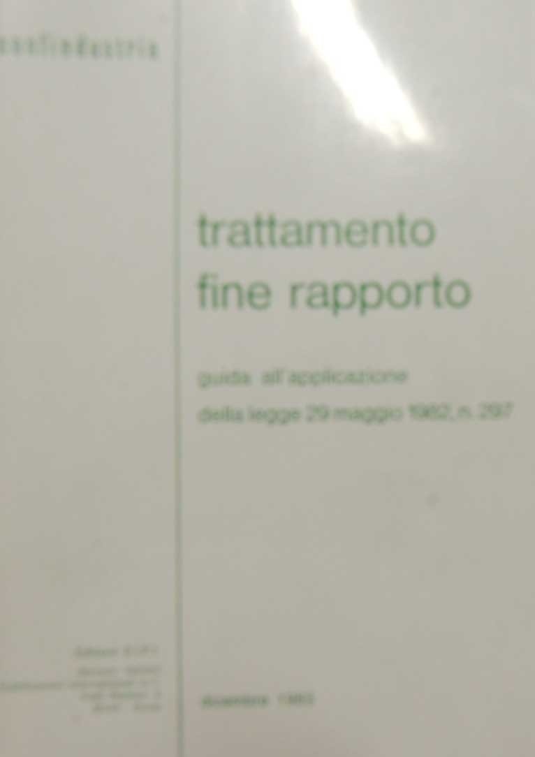 Trattamento di fine rapporto. Guida all’applicazione della legge 29 maggio 1982, n. 297, a cura di Giorgio Gramiccia e Arturo Parisi, Editore S.i.p.i. (Servizio Italiano Pubblicazioni Internazionali s.r.l.), Roma 1983, pp. 241, cm 24, br. ed. In testa al frontespizio: Confindustria – Direzione Centrale Rapporti Sindacali. Leggere tracce d’uso, per il resto ben conservato.