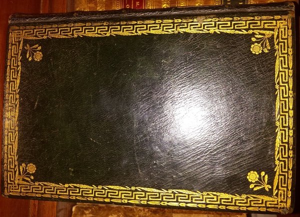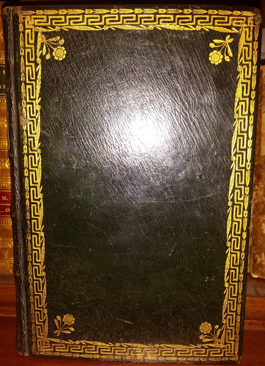 In-8 (19,5 cm) (4) 276 (2) II c. (tavole incise più volte ripiegate) III c. (di tavole con tabelle). Elegante legatura in marocchino verde, con piatti ornati ai margini da una ricca cornice formata da due righe di spighe parallele entro le quali è impresso una catena di greche. Ad ogni angolo è impresso un fregio floreale. Al dorso a quattro nervi, vengono ripresi i motivi delle cornici, assieme al tassello. Contropiatti decorati da motivi geometrici acquarellati sulla carta. Tagli spruzzati d'oro e segnalibro in tela. Condizioni perfette tranne poche pagine lievemente arrossate. Le due tavole incise contengono la rappresentazione di 35 strumenti da lavoro. La prima tabella rappresenta l'elenco dei sali più o meno solubili e di quelli insolubili nell'Alcool. La seconta tabella rappresenta le "gravità specifiche dell'Alcool, . ". La terza tabella rappresenta la "solubilità dei Sali nell'acqua .".