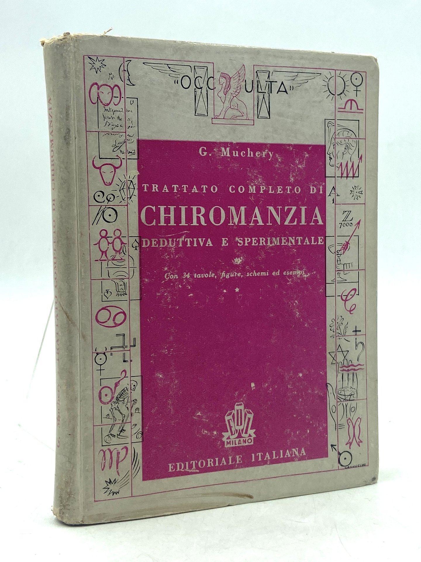 Cartonato editoriale, cm 17.5 x 12.5, pp 341 (3). Timbro di proprietà sulla prima sguardia, carte un po’ brunite e fragili ai bordi, lievi segni del tempo ma complessivamente ben conservato. Prima edizione italiana di Traité complet de chiromancie déductive et expérimentale (1933), pubblicata nella collana «Occulta» caratterizzata da graziosi fregi in copertina che riprendono simboli alchemici ed esoterici. Il trattato, illustrato da 34 figure nel testo e fuori testo, fu scritto dall'esoterista e astrologo Georges Muchery, noto per aver creato nel 1927 un mazzo di Tarocchi Astrologici il cui disegno fu affidato a Henri Armengol.