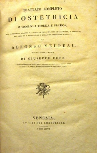 Trattato completo di ostetricia. O Tocologia teorica e pratica, con un ristretto relativo alle malattie che complicano la gravidanza, il travaglio del parto ed il puerperio, ed a quelle che interessano i neonati. Prima versione italiana di Giuseppe Coen.