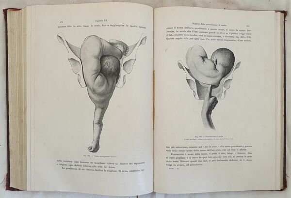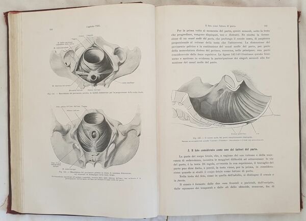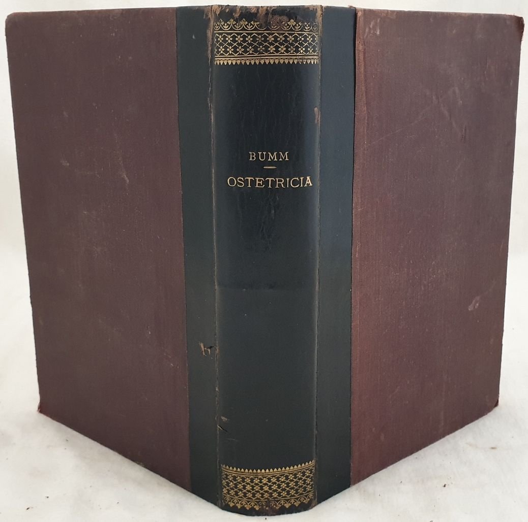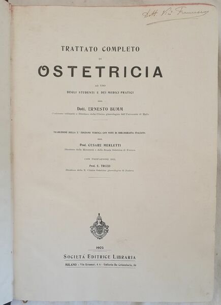 Edizione del 1905 di questo trattato completo di ostetricia scritto da Ernesto Bumm. Traduzione di Cesare Merletti e prefazione del Prof. E. Truzzi. All'interno: Parte fisiologica (fecondazione, fisiologia del feto, Modificazioni gravidiche, diagnosi di gravidanza, considerazioni sul parto, meccanismo del parto, decorso clinico, gravidanza multipla ecc.) Parte patologica (malattie dell'organismo materno, malformazioni e anomalie, interruzione spontanea di gravidanza, DEcorso della gravidanza e del parto, Emorragie, Febbre puerperale, Antisepsi ecc.), Operazioni ostetriche. All'interno sono presenti numerose foto illustrazioni e qualche planche. Firma al frontespizio. In buone condizioni e completo. Copertina in mezza pelle coeva con titolo e decorazioni in oro al dorso in buone condizioni generali con lievi usure ai margini e dorso. Legatura in buone condizioni. All'interno le pagine si presentano in buone condizioni con fioriture. In 4. Dim. 29,5x22 cm. Pp. XVI+788. Peso Kg. 2,660.Edition of 1905 of this complete treaty opf obstretrician written by Ernesto Blumm. Translation by Cesare Merletti and prefation by Prof. E. Truzzi. Inside: Physiology (fecondation, physiology of pheotus, modifications, diagnosis of pregnancy, delivery, multiple pregnancy ecc.) pathological part (deseases of organism, malformations, spontaneous interrumption of pregnancy, hemorragies, Fever, Antisepsis ecc.), Obstetrical operations. Inside there are some photoes illustrations and some planches. Cover is preserved inside. In good conditions and complete. Half leather coeval cover with golden title and decorations in the spine in very good general conditions slightly worn in the edges and spine. Binding in good conditions. Inside pages are in good conditions with foxing. In 4. Dim. 29,5x22 cm. Pp. XVI+788. Weight Kg. 2,660.