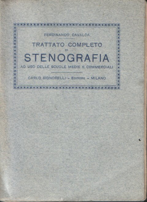 In-16°, pp. XVI, 399, copertina editoriale. Alcuni segni e note a matita. A p. 51 una nota a penna rossa a fondo pagina. Indice: Cenni storici della Stenografia. Parte prima. Formazione delle parole. I. Definizione - Divisione del sistema stenografico - Principii fonetico ed etimologico - Pendenza, rigatura e grandezza dei segni - Alfabeto - Delle vocali e delle consonanti; II. Unione dei segni - Spostamento dei segni - Vocali finali - Indicazione delle vocali medie - Vocale E media; III. Consonanti doppie; IV. Consonanti composte (I e II modo); V. Vocale O media; VI. Consonanti composte (III e IV modo); VII. Vocale E media (seguito); VIII. Vocale A media (sigle); IX. Vocale A media (seguito); X. Vocale I media; XI. Vocale I media (seguito); XII. Vocale U media; XIII. Vocale U media (seguito); XIV. Vocali iniziali; XV. Vocali iniziali (seguito); XVI. Dittonghi; XVII. Dittonghi (seguito); XVIII. Trittonghi e polittonghi; XIX. Nomi propri - Consonanti apostrofate - Interiezioni - Segni d'interpunzione. Parte seconda. Abbreviazione delle parole. XX. Abbreviazioni in genere, degli articoli e delle preposizioni semplici e articolate; XXI. Abbreviazioni degli aggettivi comparativi e superlativi; XXII. Sigle dei pronomi; XXIII. Abbreviazioni dei verbi; XXIV. Abbreviazioni dei verbi essere e avere; XXV. Abbreviazioni dei verbi volere e potere; XXVI. Abbreviazioni dei verbi dovere e fare; XXVII. Abbreviazioni dei verbi lasciare e conoscere; XXVIII. Abbreviazione delle particelle prepositive (Monosillabe); XXIX. Abbreviazione delle particelle prepositive (Bisillabe); XXX. Abbreviazione delle desinenze di derivazione (I parte); XXXI. Abbreviazione delle desinenze di derivazione (II parte); XXXII. Desinenze composte - Abbreviazione di desinenze medie e di radici; XXXIII. Sigle degli avverbi, delle preposizioni e delle congiunzioni - Altre sigle ed abbreviature; XXXIV. Parole derivate dalle sigle - Frasi avverbiali; XXXV. Sigle parlamentari - Abbreviazione dei numeri; Dizionario delle sigle fondamentali. Parte terza. Abbreviazione logica. XXXVI. Preliminari: XXXVII. Abbreviazione radicale; XXXVIII. Abbreviazione formale; XXXIX. Abbreviazione mista; XL. Abbreviazione della frase (omissione delle parole); Parte quarta: Letture stenografiche.