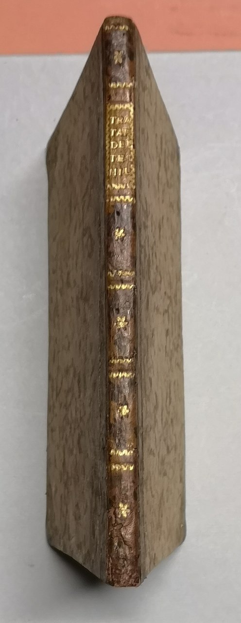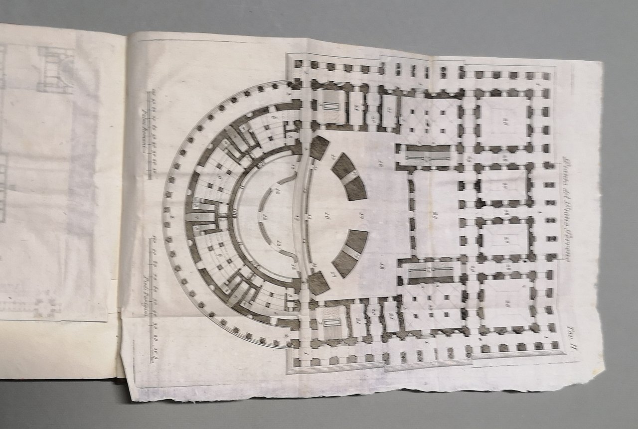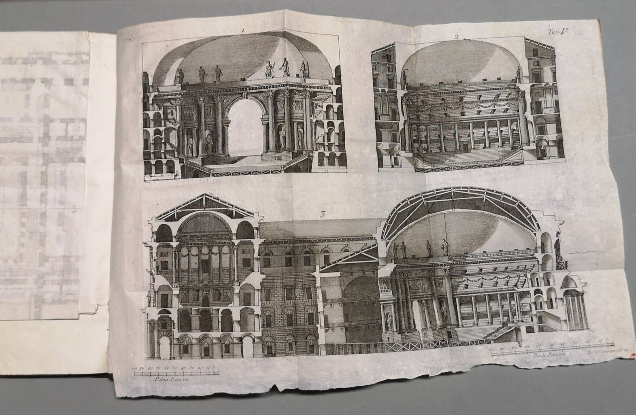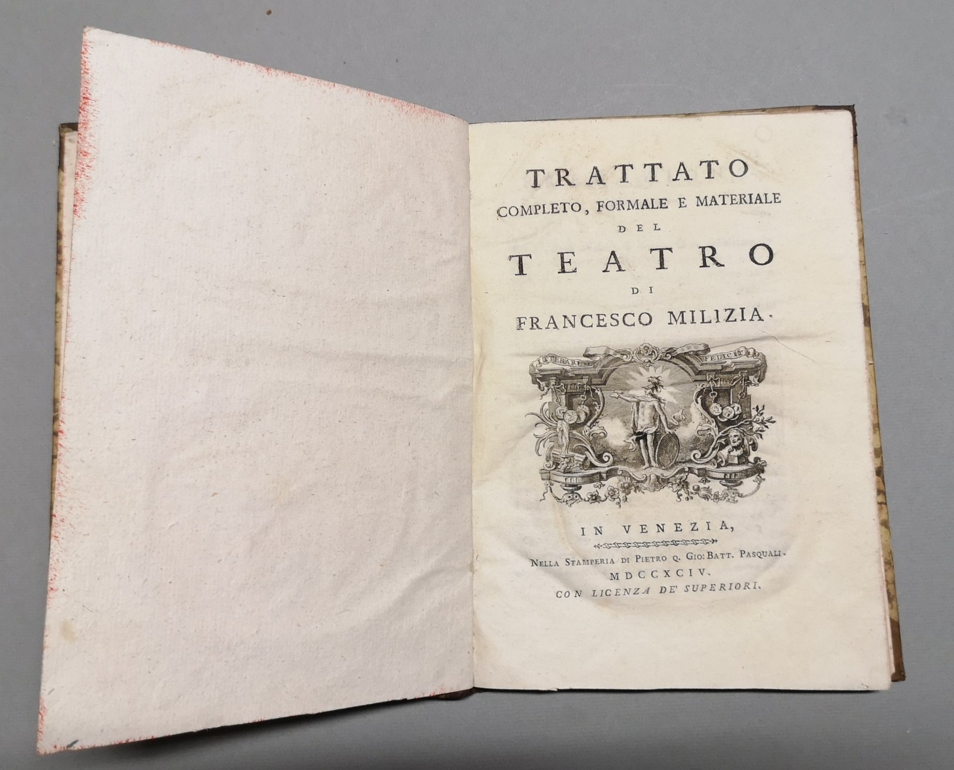 >in-4, pp. 104, leg. coeva m. pelle, tass. con tit. oro al dorso. Impresa tipogr. inc. al tit., testatina ed iniz. silogr. Con le medesime 6 tavole del teatro ideale incise da Seb. Giampiccoli e ripieg. f.t. Quinta edizione, pubblicata con il nome dell'autore ed il titolo più esteso; mantiene la medesima prefazione del 1773, ma non la dedica all'Algarotti. Fu probabilmente grazie al cambiamento di titolo che il Milizia poté apporre il suo nome all'edizione. Non comune. Buon esempl. Fowler n. 196. Schlosser-Magnino p. 683.