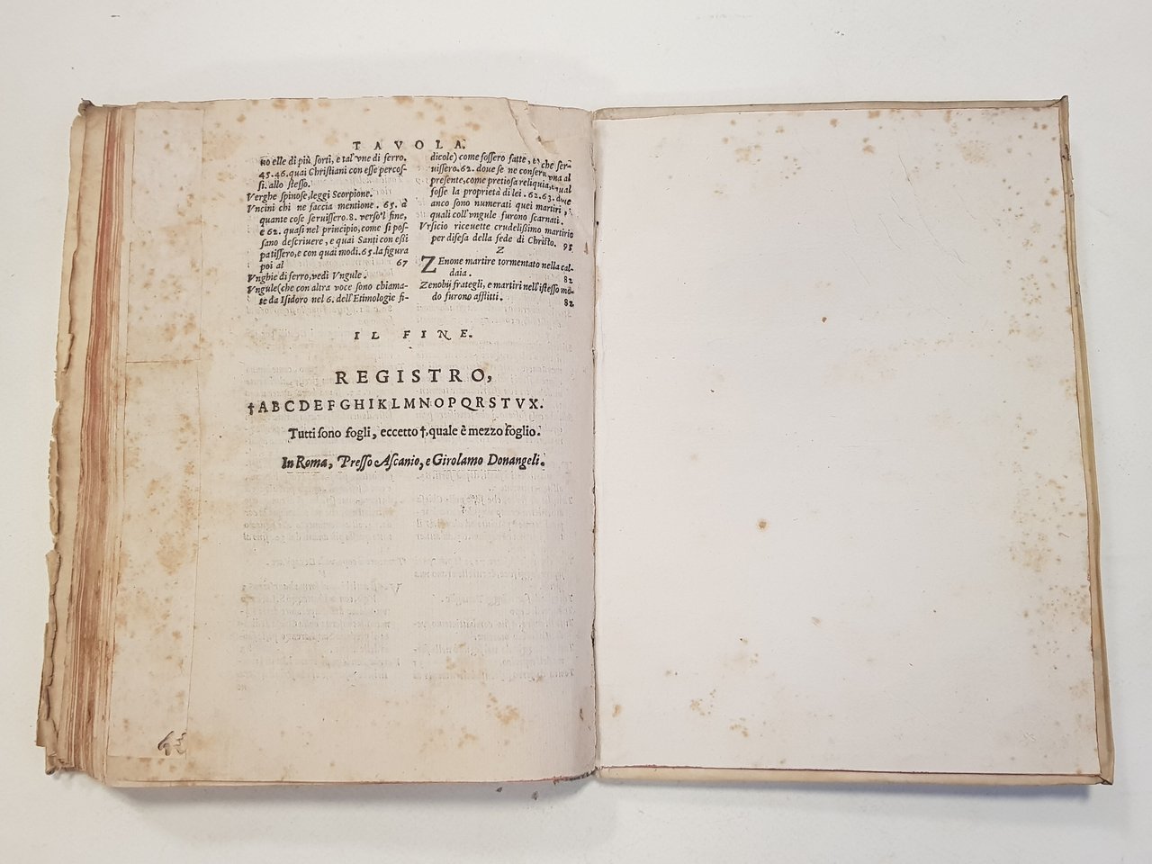 Cm. 23,5 x 17,5; pp. (4), 159, (9) con frontispizio stampato in rosso e nero, testatine, finalini e capilettera ornati xilografici; 47 tavole entro cornice incise in rame da Antonio Tempesta; legatura posteriore (settecentesca?) in tutta pergamena con tassello al dorso; taglio colorato in rosso.<BR>CONDIZIONI: piccoli fori di tarlo al dorso; mancanza di cm. 3,5 x 17 al margine inferiore del frontispizio (forse eliminata un'indicazione di appartenenza); restauro (non professionalmente ma vecchio) al margine delle prime 6 e delle ultime 12 pagine; alcune fra le prime pagine sono sciolte (difetto di rilegatura sul margine troppo breve): queste pagine hanno anche il margine esterno, che sporgeva dal corpo del libro, con piegature e strappetti; uniforme ingiallitura della carta.<BR>CONDIZIONI NON PARTICOLARMENTE BUONE NEL COMPLESSO, ma comunque accettabili in quanto non condizionano più di tanto il godimento di un'opera famosa, nel suo genere straordinaria e notevolmente rara.<BR>Raro ( Brunet II, 1468; Graesse III, 19).<BR>