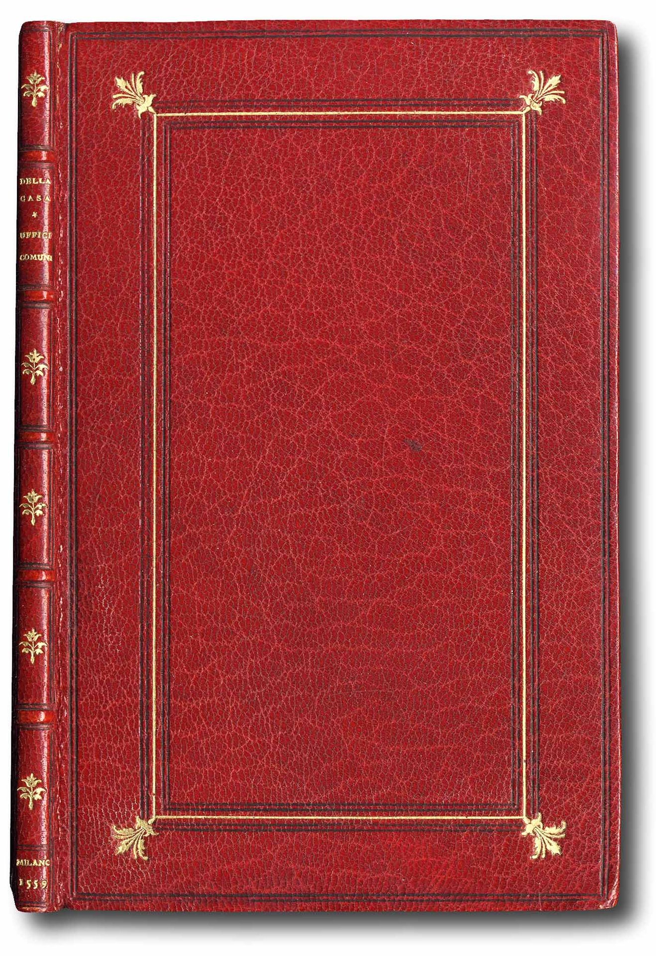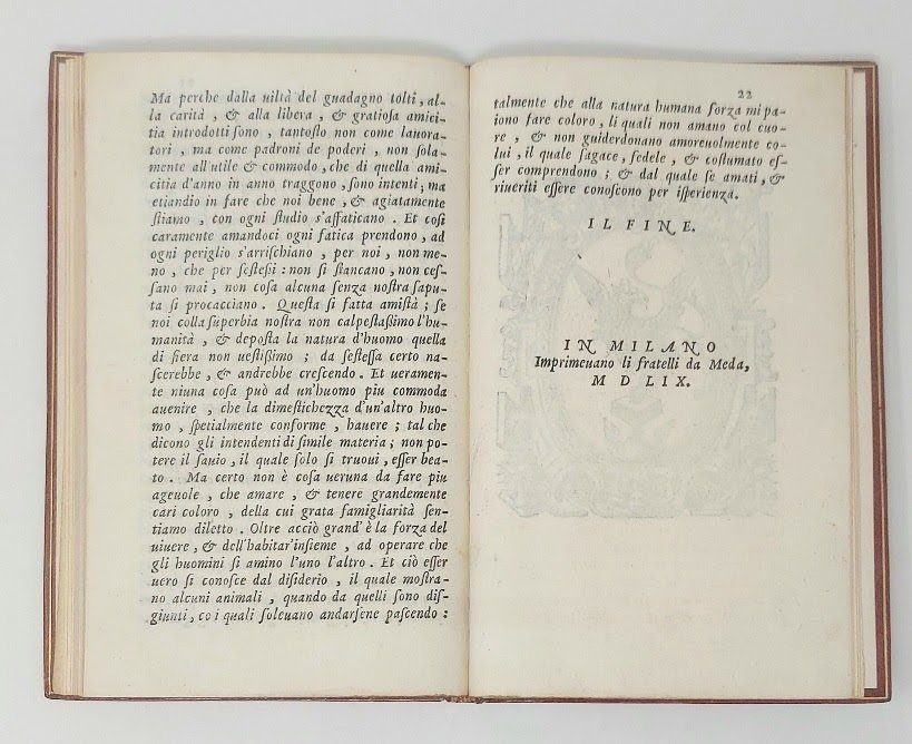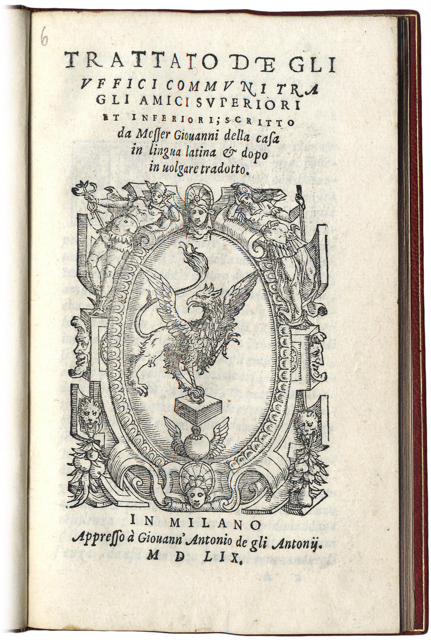 >in-8 (155x95 mm), ff. 22, (2 bianchi), caratt. corsivo. Legatura moderna d'amatore in marocchino granata, filetti a secco e in oro ai piatti; titolo in oro su dorso a nervi, tagli dorati. Al frontispizio ed in fine bella grande impresa xilografica dell'editore entro elaborato medaglione. Edizione originale della traduzione italiana e probabilmente prima assoluta del ''De officiis inter potentiores et tenuiores amicos'', composto in latino intorno al 1544. Il volgarizzamento è attribuito al Della Casa stesso, soprattutto per ragioni di natura linguistica. Questo trattatello precede di qualche anno la stesura del Galateo anticipando «per molti aspetti l'analisi del costume e i saggi consigli che ritorneranno in forma più libera nell'opera maggiore insieme con l'affermazione dell'ideale supremo della misura » (Milanini). Ottimo esemplare. Gamba 283, note. Santosuosso Bibliogr. della Casa, 20. STC 152. Adams C-812.