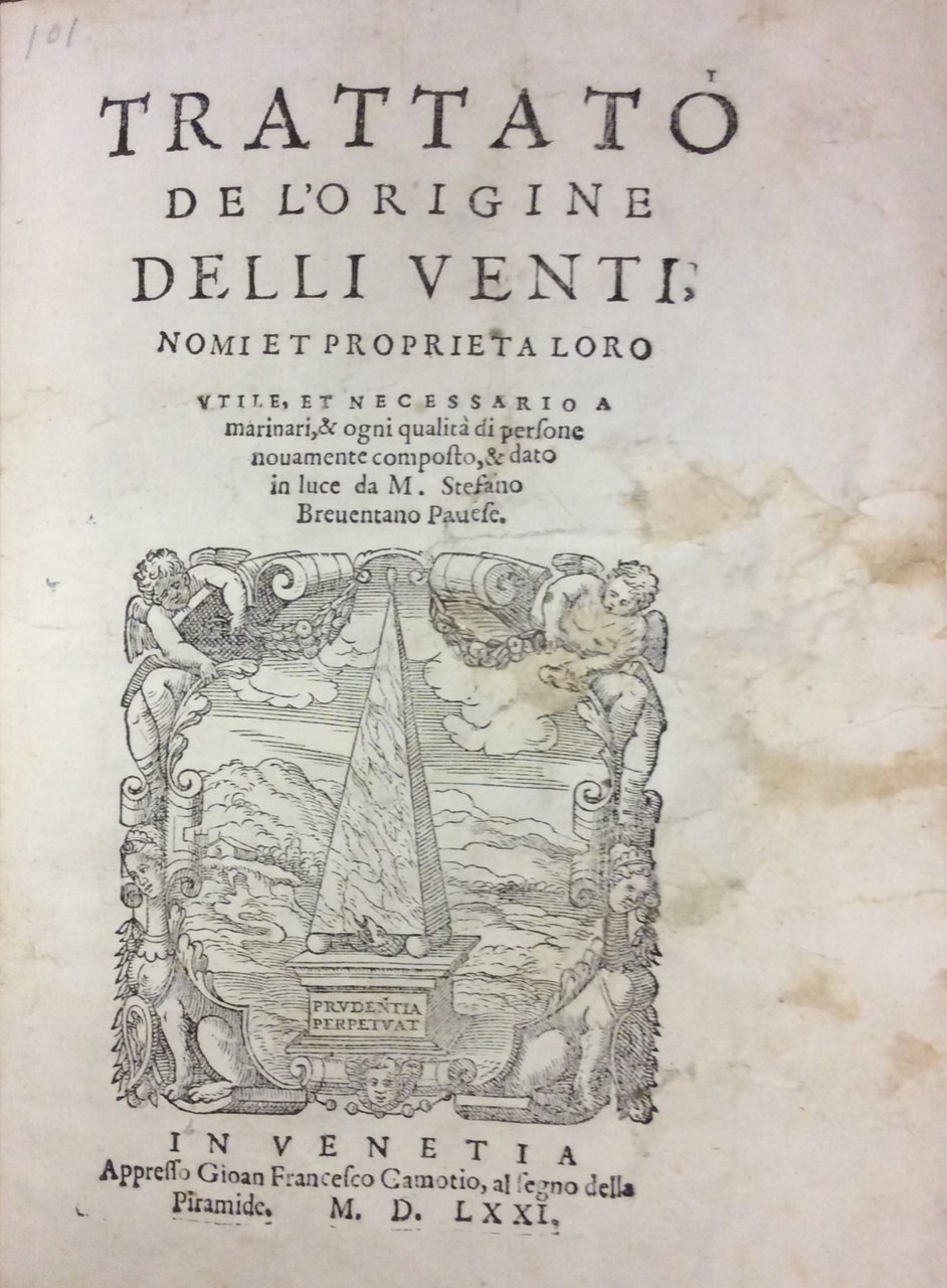TRATTATO DE L'ORIGINE DELLI VENTI, NOMI ET PROPRIETA LORO. - Utile, et necessario a marinari, & ogni qualità di persone novamente composto, & dato in luce da M. Stefano Breventano Pavese.