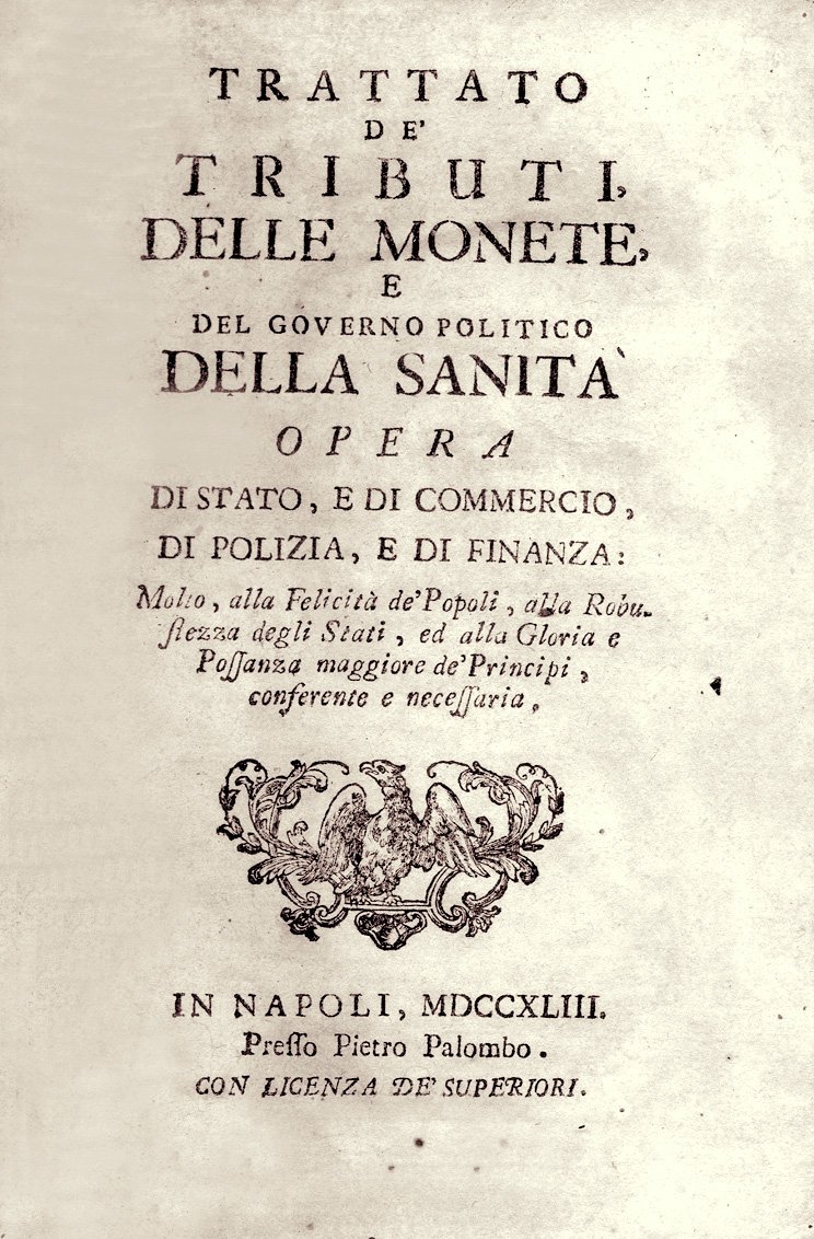 Opera di Stato, e di Commercio, di Polizia, e di Finanza: molto, alla Felicità de’ Popoli, alla Robustezza degli Stati, ed alla Gloria e Possanza maggiore de’ Principi, conferente e necessaria. Napoli, Palombo, 1743. In-8°, buona legatura coeva in piena pergamena con tit. calligraf. al dorso; pp. (14)-XVIII-572-(4) bruniture uniformi. Cfr. Cossa, 250: “Primo trattato metodico dei tributi superiore di molto ai cameralisti suoi contemporanei”; Einaudi, 709. Edizione originale dell’opera dell’economista napoletano. Buon esemplare.