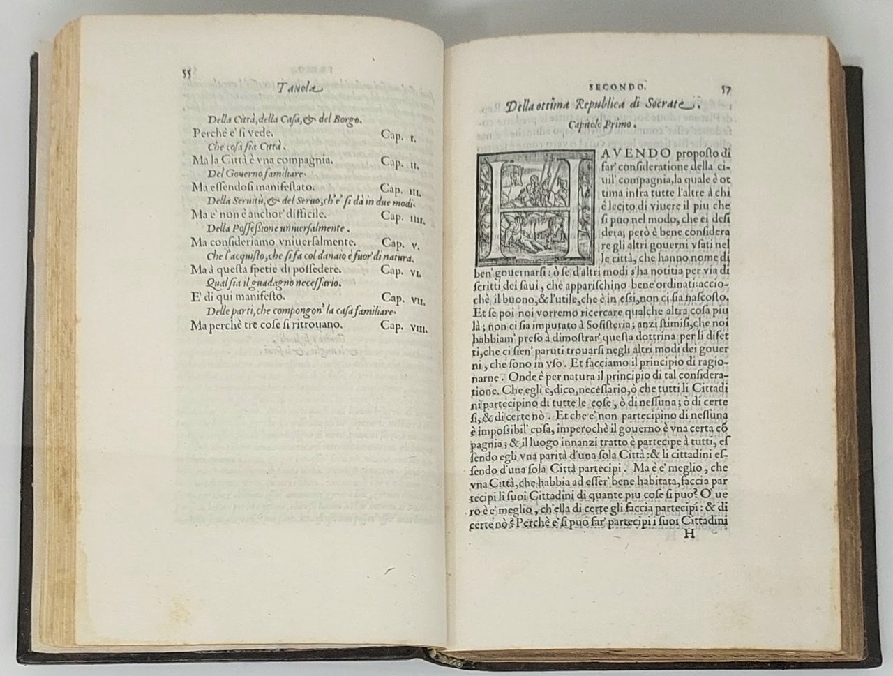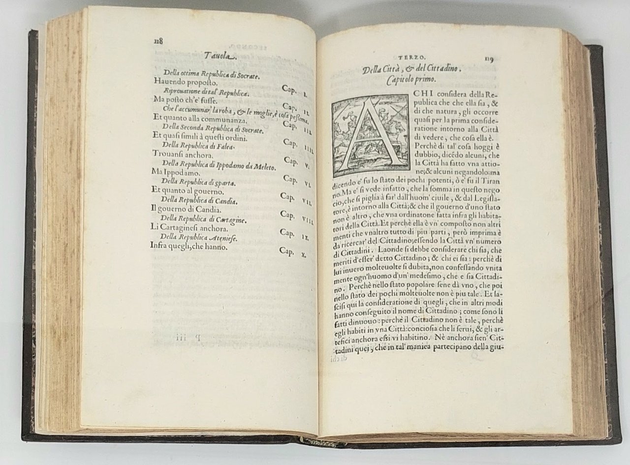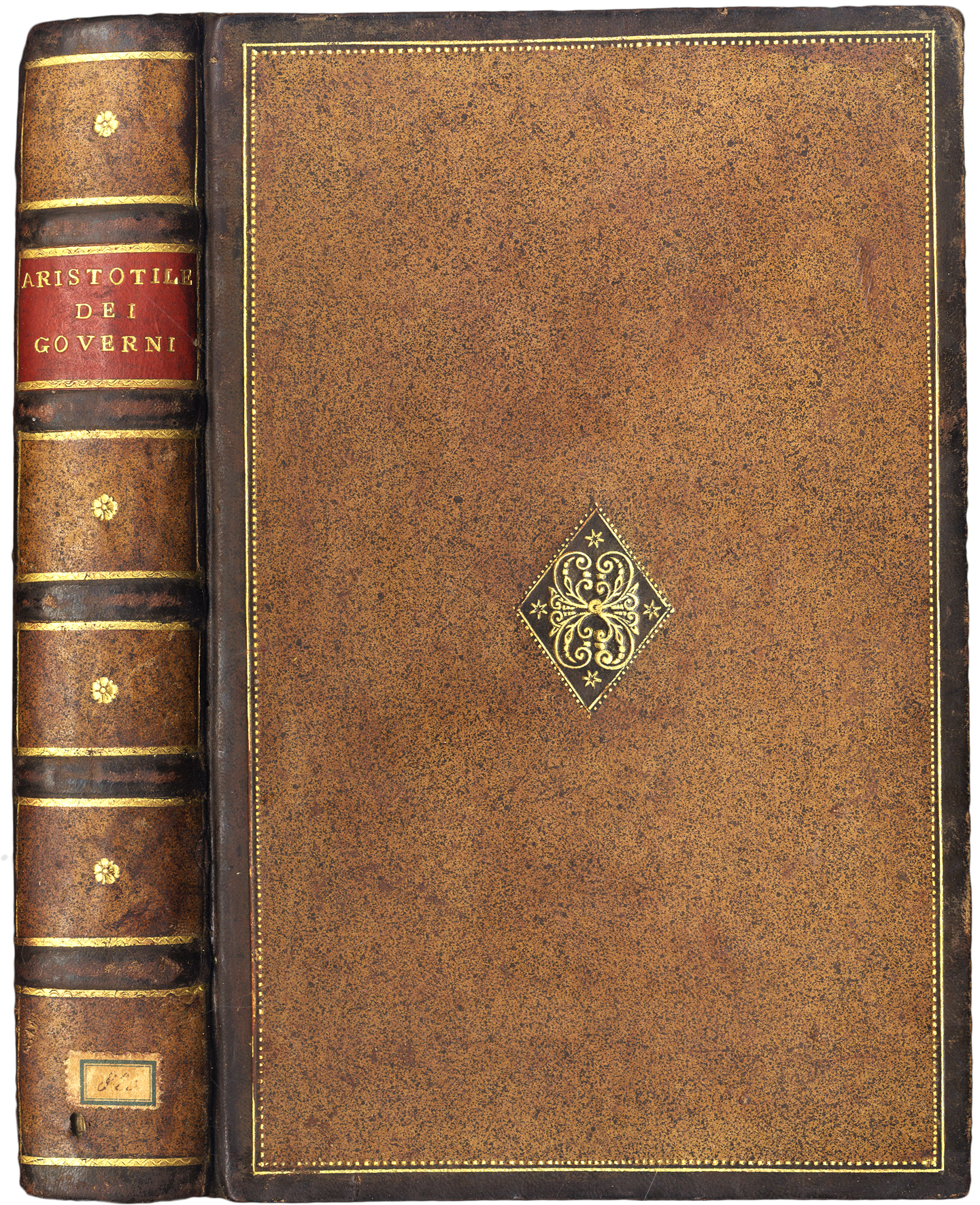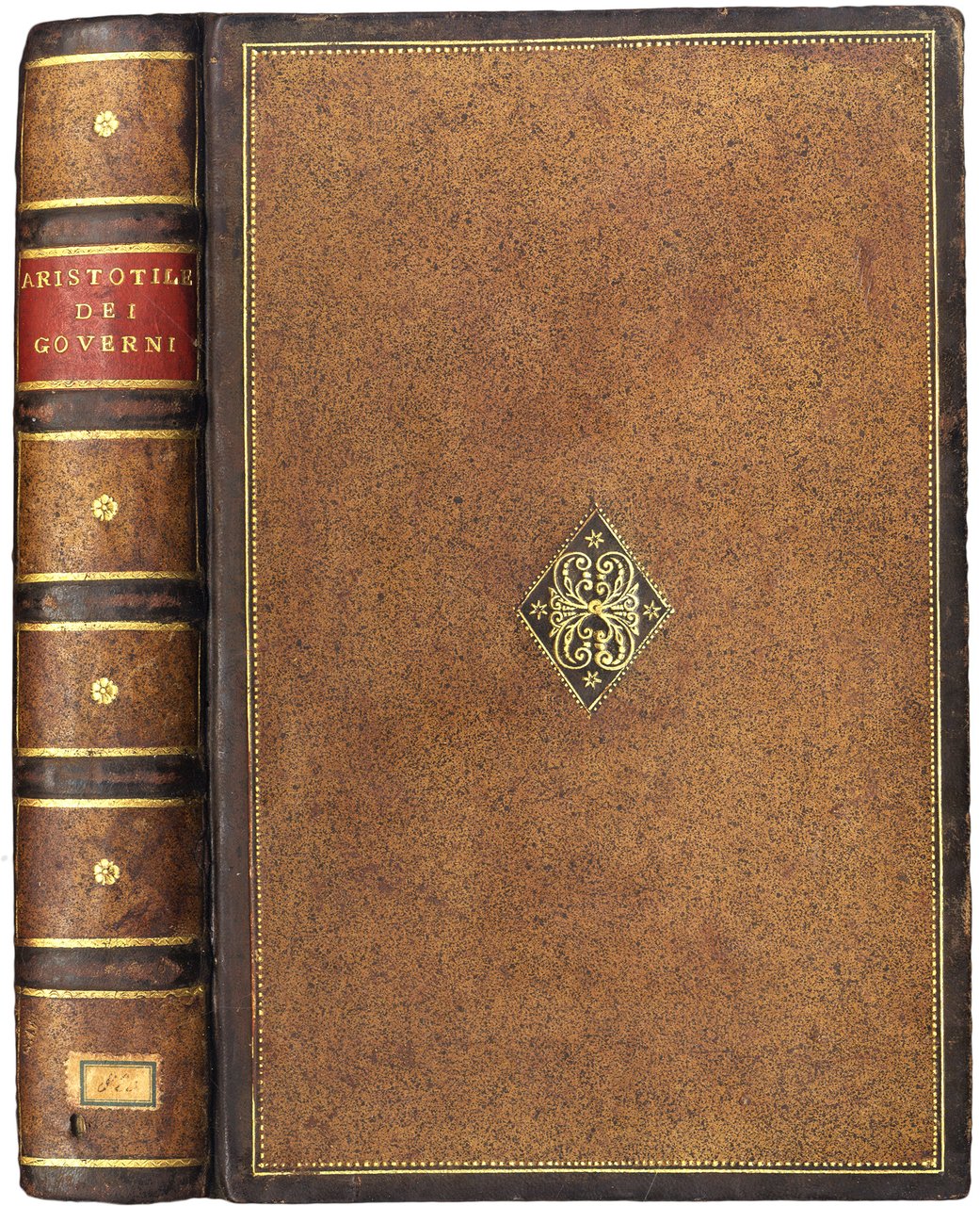 >in-4 (214x135 mm), pp. 420, (20). Raffinata legatura 700esca in piena pelle in due toni di colore marrone, intarsio romboidale ai piatti con fregio centrale, dorso a nervi con titolo su tassello rosso, tagli dorati. Grandi capilettera silografici istoriati. Prima edizione della traduzione di Bernardo Segni, dedicata a Cosimo de Medici. Le venti pagine in fine contengono un vasto indice: "tavola delle cose più notabili della politica di Aristotile". Edizione non comune, impressa con gran cura su carta forte. Buon esemplare, con alcune marginali fioriture. Gamba, Testi di Lingua. n.91. Moreni, Annali, pp.66-67. BMC 53.