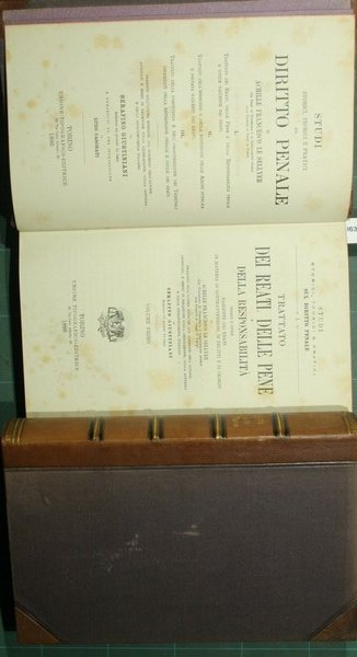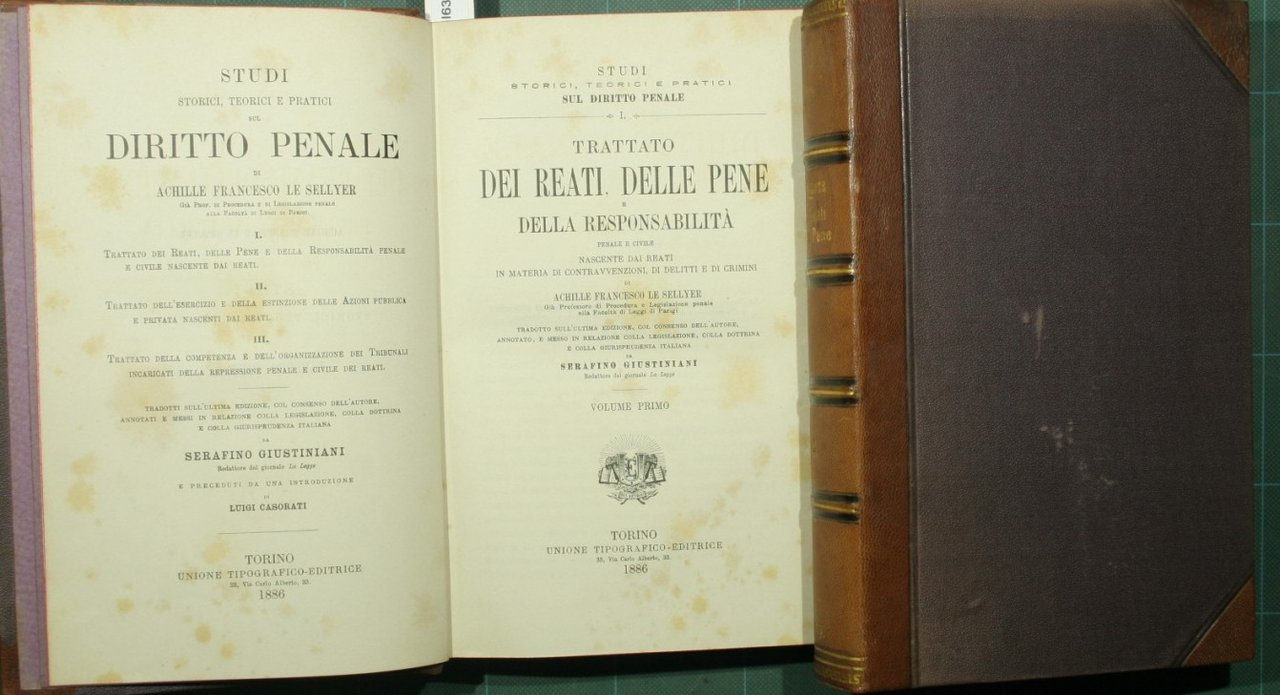 Nascente dai reati in materia di contravvenzioni, di delitti e di crimini - Tradotto sull'ultima edizione, col consenso dell'autore, annotato e messo in relazione colla legislazione, colla dottrina e colla giurisprudenza italiana da Serafino Giustiniani - Collana Studi storici, teorici e pratici sul diritto penale. Vol. I - Nn. 1-2 - in 8° - pp.XII + 550; 662 - Mezza pelle con titolo e fregi in oro al dorso nervato - Due volumi - Tagli rossi