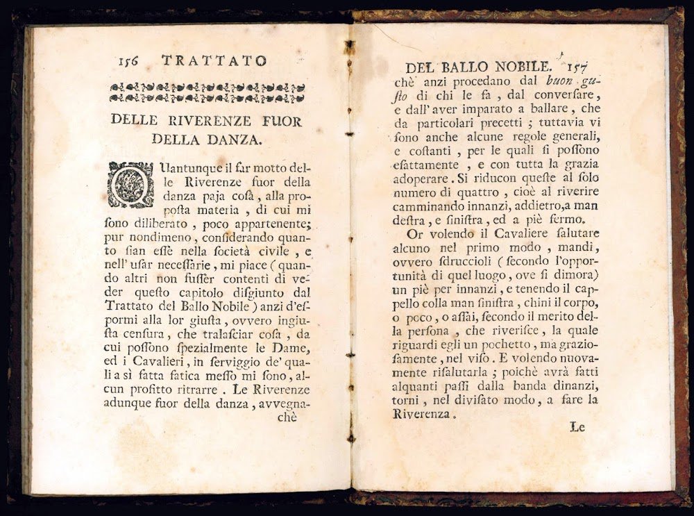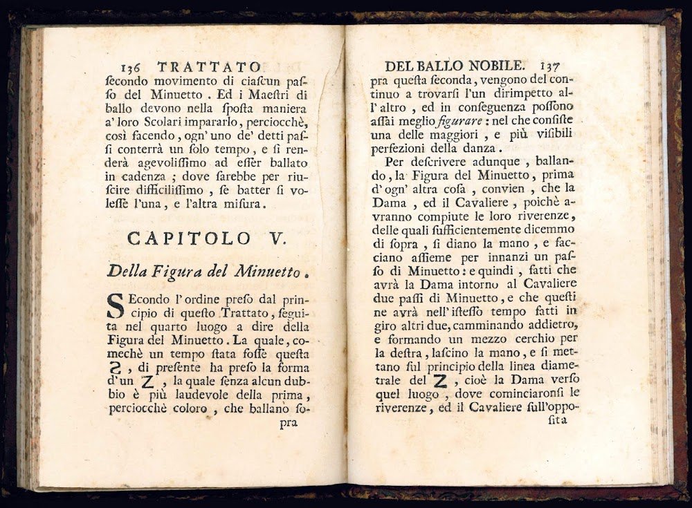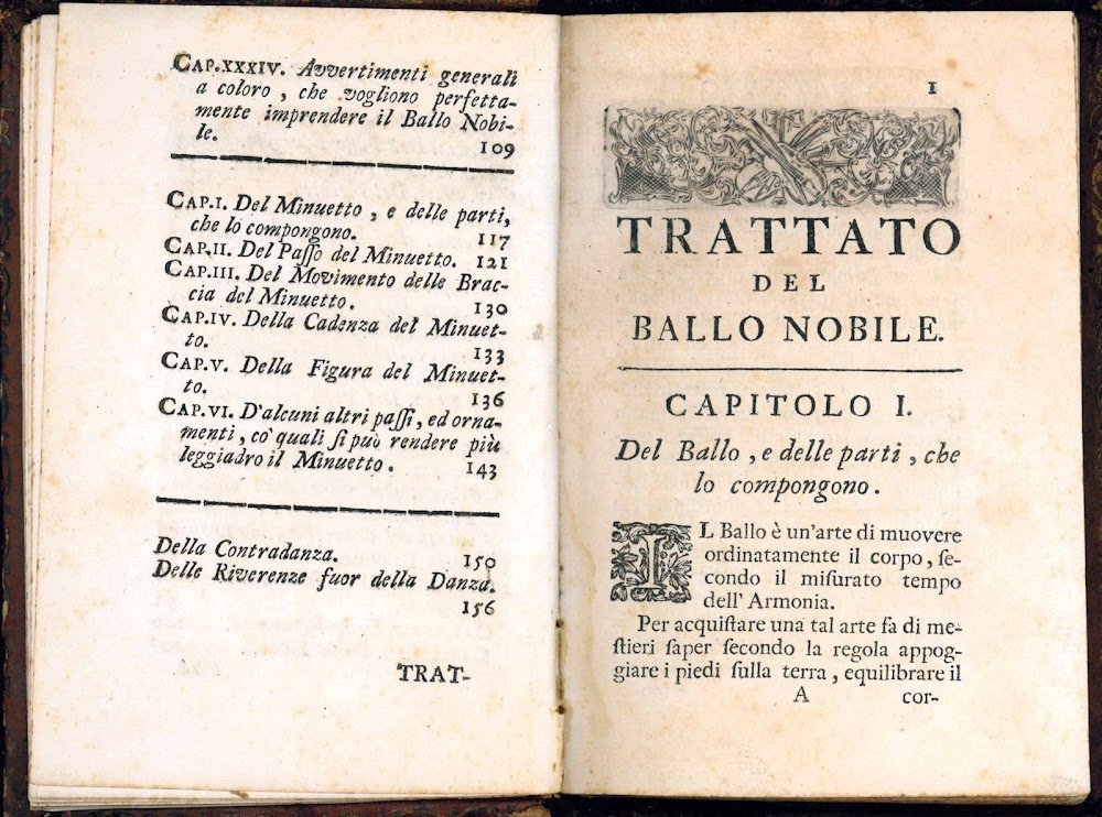 The first part of the work deals with the general theory of the “noble dance”, and consists of thirty-four chapters devoted to instructions for steps required in Italian Baroque dance including pirola (pirouette), sfuggito (echappé), passo unito (assemblé), and cadente (tombé). Each step is fully described and notated in Feuillet notation. The second part contains six chapters devoted to performance of the minuetto (minuet) and concludes with a section on the ‘contraddanza' (or contradance or countrydance) and riverenze (bows). The work thus deals mainly with ballroom dance and only marginally with theater dance. In the preface, the author recalls the Italian origins of measured dance, referring to authors such as Rinaldo Rigoni and Fabrizio Caroso, but also stresses the importance of the improvements later introduced by the French masters Pierre Beauchamps and Guillaume-Louis Pécour (cf. B. Sparti, Giambattista Dufort and la Danse Noble - Italian Style, in: “Proceedings of the Eleventh Annual Conference of the Society of Dance History Scholars”, Riverside, University of California, 1988, pp. 216-232).
