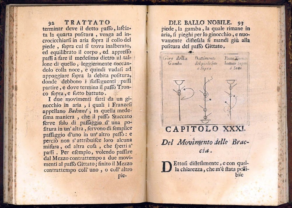 First edition of this important treatise on choreography, the first to introduce in Italy Raoul-Auger Feuillet's system of shorthand dance notation (which was first described in 1700 in his Chorégraphie, ou l'art d'écrire la danse), here skillfully reproduced in the numerous engraved diagrams that accompany the text.