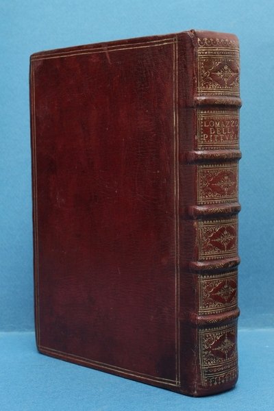 In - 8ø; 20 cc., 700 pp., 1 c.; bella legatura seicentesca in tutto marocchino, titolo e fregi in oro al dorso, doppio filetto in oro ai piatti (restauri alle cuffie), tagli dorati. Ottimo esemplare, solo uno strappo restaurato a p. 459 senza perdite. Ex libris Emil B. Goldschmidt. Prima tiratura della prima edizione della "Bibbia al Manierismo" (Schlosser). Lomazzo fu pittore e letterato milanese amico di Gaudenzio Ferrari. Questa sua opera Š il pi— esaustivo e sistematico trattato sull'arte del Cinquecento. E' diviso in sette libri, il primo sulle proporzioni, il secondo sul movimento, il terzo sul colore, il quarto sulla luce, il quinto sulla prospettiva, il sesto sulla tecnica; il settimo contiene un completo manuale sulla iconografia cristiana e classica. Si tratta della migliore esposizione delle principali dottrine del Manierismo; notevole il suo valore storico per le numerose e diffuse notizie sulla vita artistica milanese anche del periodo precedente. "Si possono citare, tra le altre, le notizie su Gaudenzio Ferrari, dalla cui scuola mediatamente proveniva, sui pi— antichi pittori e prospettici milanesi come Foppa, Zenale, Bramantino; gi… si disse (libro II) che egli possedesse scritti originali oggi perduti, dei quali ci d… dei compendii. Lo stesso dicasi del principe della scuola milanese, Leonardo, sul quale il Lomazzo d… in parte notizie importantissime, specie sugli scritti da lui lasciati (libro II)" (Schlosser). Fowler 186. Cicognara 4612. Schlosser Magnino, pp. 344 e ss. Vagnetti EIIb34.