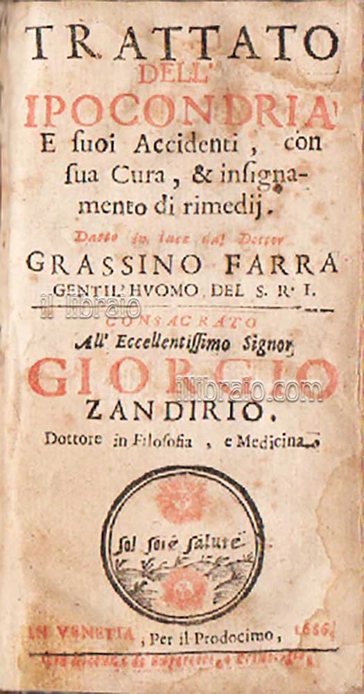 in 24° (13,2 x 7 cm. ca.); pp. (12), 126, (2), leg. in tutta pergamena con titolo al dorso; 1^ ed. Marca tipografica (Sol sol è salute) sul frontespizio bicolore, in rosso e nero. Rara ediz. orig. di questa opera sull’ipocondria scritta da Grassino Farra poi ristampata a Bologna nel 1699 e a Bergamo nel 1725 (cfr. Krivatsky 3901). (Alcuni errori d’impaginazione pp.42/43 numerate come 18/19. Le pp. 21/22, 23/24, mancanti, sono state riprodotte fedelmente su carta antica. Leggerissimi aloni di umidità sui bordi delle pagine che non ne compromettono minimamente la lettura. Nel complesso esemplare molto buono)