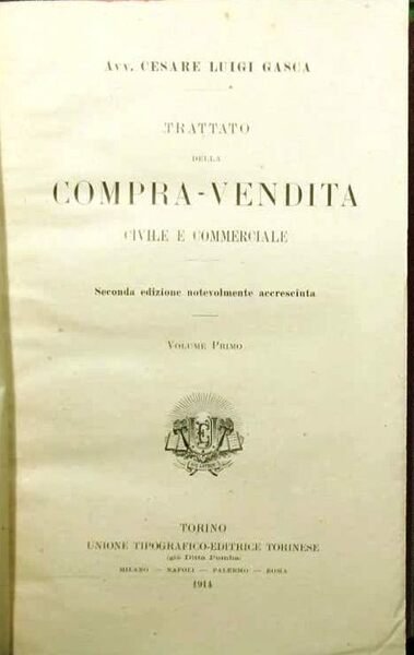 avv. Cesare Luigi Gasca, Trattato della compra-vendita civile e commerciale. Volume Primo. Seconda edizione notevolmente accresciuta.