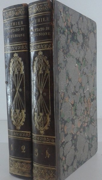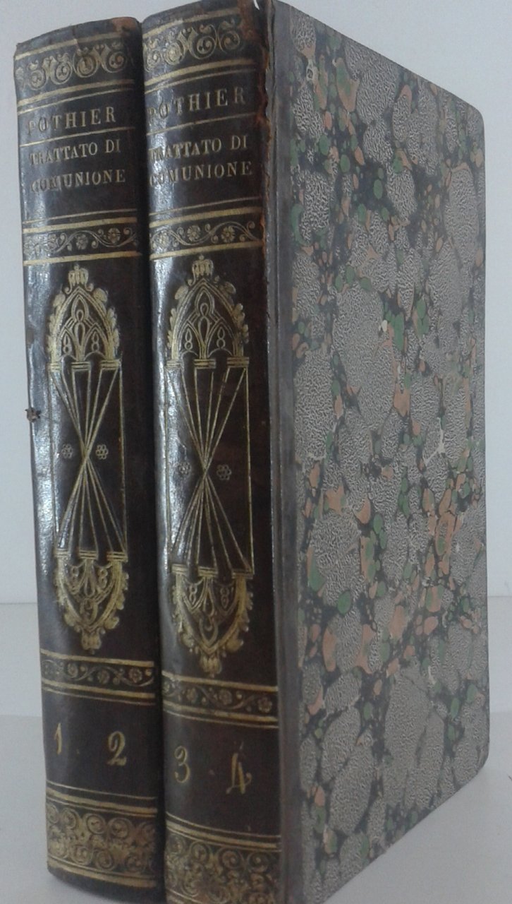 Quattro volumi rilegati in due tomi. Legatura in mezza pelle con titoli ed eleganti fregi in oro al dorso, in buone condizioni: leggere spelature alle cerniere e alle cuffie. Firma di appartenenza al foglio di guardia anteriore. Tagli colorati in giallo. Carte brunite con sparse fioriture. Macchia giallastra alle prime quattro carte del terzo volume.