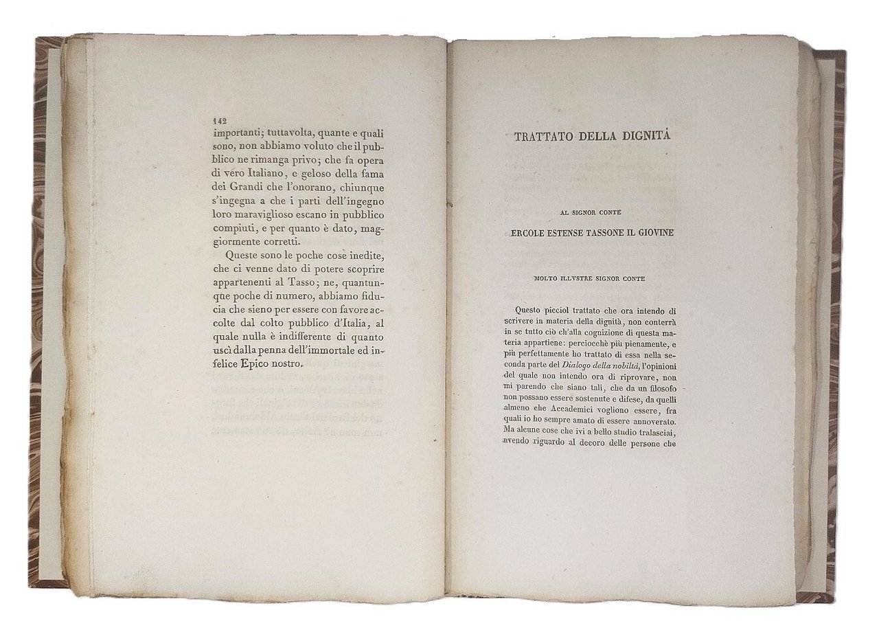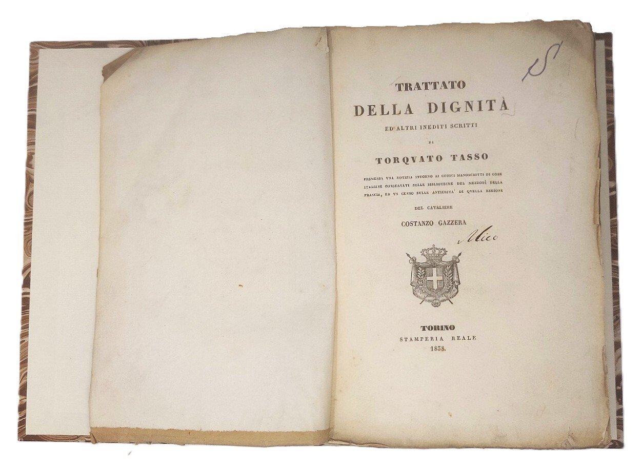 >in-8, pp. (4), 202, (2), broch. edit. muta, protetta da camicia e cofanetto cartonati moderni, titolo oro al dorso su tass. in pelle. Dedica di Gazzera al re Carlo Alberto. Oltre l'ampio e profondo studio d'interesse filologico e bibliografico del Gazzera, che abbraccia le prime 142 pagine, il volume, di notevole importanza e rarità, contiene l'edizione originale dei seguenti scritti del Tasso: Trattato della dignità, Lettere, Favola della Gerusalemme, Dubbi e risposte intorno alla Gerusalemme, Varie lezioni del Mondo creato, Ultime due ottave del Monte Oliveto. I codici degli inediti tassiani furono casualmente rinvenuti dal Gazzera nella biblioteca di Montpellier tra i manoscritti della "Collectanea Guichenoniana", precedentemente conservati in Casa Albani a Roma (vedi p. 85). Esemplare su carta forte, a pieni margini. Racc. Tassiana Bergamo n. 86.