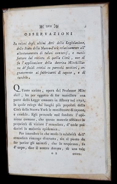 In 8°; (4), 223, (1) pp. Bella legatura coeva in piena pergamena con titolo impresso in oro al dorso. Qualche minima ed insignificante macchiolina di foxing ma nel complesso esemplare in buone-ottime condizioni di conservazione. Prima non comune edizione italiana di questopera medica e storica di interesse americano. Valentin (1758-1829) fu tra i primi a condannare in modo deciso la pratica dei salassi. Praticò prima a Santo Domingo come chirurgo militare anziano, per poi si spostarsi negli Stati Uniti, dove, per le sue grandi doti mediche, venne ben presto nominato direttore dellospedale della Marina francese a Norfolk, in Virginia. Fu anche membro della Società Filosofica di Filadelfia, di quella di Agricoltura, Arti e Manifatture di Albany (New-York), dellAccademia Americana di Cambridge (Massachusetts) e membro di varie accademie europee. Rientrato in età anziana in Francia e si stabilì a Nancy. Miner Yellow Fever Collection, 388 : Valentin was one of the earliest published proponents of yellow fevers local origins and non-contagiousness. Lopera qui presentata, fra le più celebri di Valentin, trae spunto dallesperienza diretta di una grave epidemia di febbre gialla che imperversò in nord America sul finire del XVIII° secolo partita da Philadelphia e poi velocemente propagatasi a New York, Wilmington, Baltimora e in tutta la parte occidentale del nord America. Lopera ricostruisce la storia delle epidemie di febbre gialla che colpirono il territorio nordamericano presentando le varie teorie sullorigine di questa malattia. Lautore analizza i vari metodi curativi e preventivi. Interessante lultimo capitolo dedicato ad una celebre decisione legata alla salute pubblica, una delle prime al mondo, adottata dalla città di New York che obbligò allo spostamento di alcune attività industriali fuori dal territorio della città di perché ritenute, in base alla dottrina di Mitchell sui fluidi scettici come perniciose per lambiente e le persone. In particolare vennero spostate le attività di fabbricanti di saponi e candele. Buono-ottimo esemplare in prima edizione ed in bella legatura. Non comune. Rare, good copy.