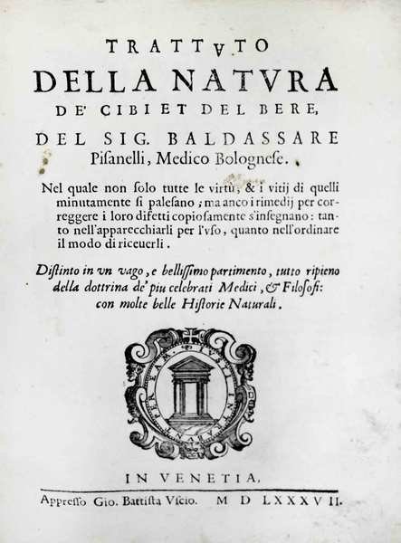 In-16 gr. (mm. 198x148), p. pergamena coeva, 4 cc.nn., 162 (ma 152) pp.num. (omesse nella numerazione le pp. 145-154); marca tipografica al frontespizio (in cornice: porta con architrave sorretta da colonne. Motto: Iusti intrabunt per eam). La parola TRATTATO del titolo ha il carattere tipografico A rovesciato.Nell'opera non solo tutte le virtù, & i vitij di quelli minutamente si palesano; ma anco i rimedij per correggere i loro difetti copiosamente s'insegnano: tanto nell'apparecchiarli per l'uso, quanto nell'ordinare il modo di riceverli.Simon ritiene l'opera del Pisanelli uno dei più celebrati trattati di dietetica del suo tempo. Comprende liste di cibi e di vini suddivisi per categorie (selvaggina, pesce, frutta, verdura, condimenti, vini rossi e bianchi, ecc.) e descrive le loro proprietà nutrizionali, la storia naturale e altro ancora. Cfr. Bitting, p. 372: "Pisanelli practised medicine in Bologna in the 16th century and became celebrated through the erudition shown in this work - Simon,1172 - Westbury, 6, p. 174 - Vicaire, pp. 682-86 per le numer. ediz. del 5/'600 e le traduz. in latino e francese. Con uniformi ingialliture, lieve alone su una decina di carte, ma complessivamente buon esemplare.