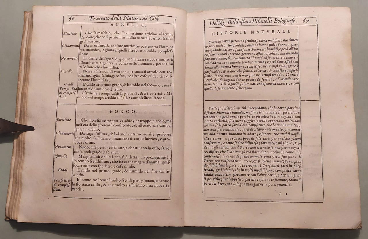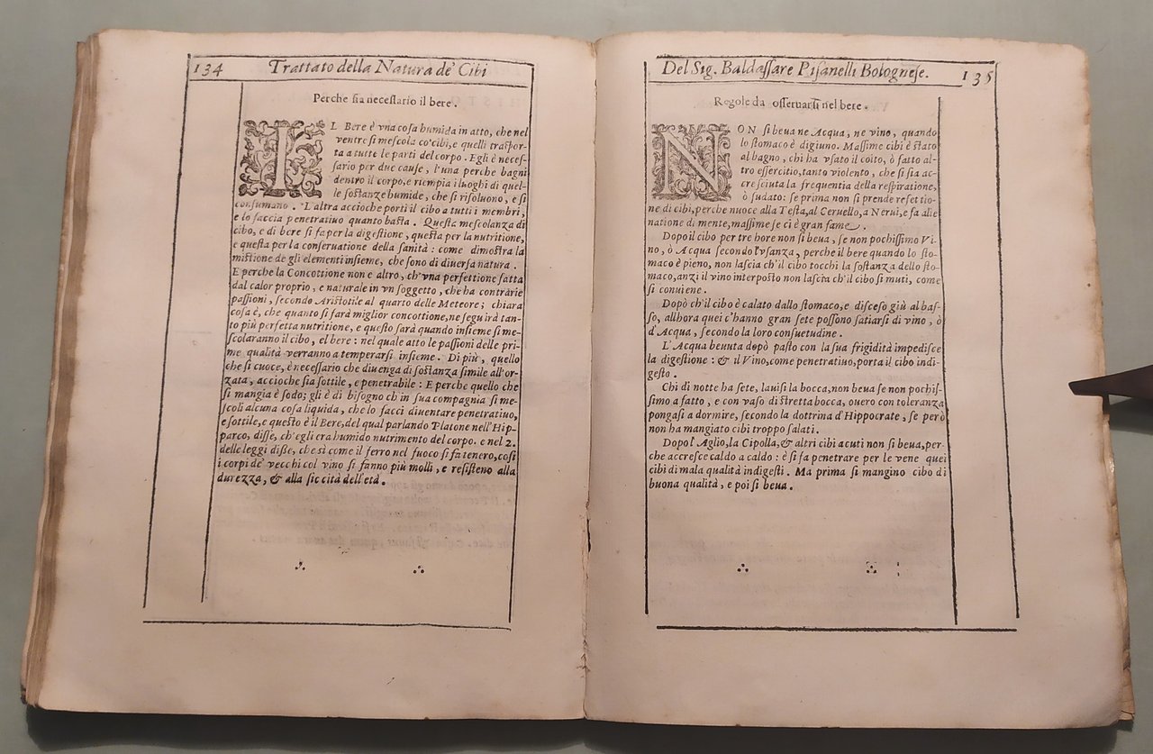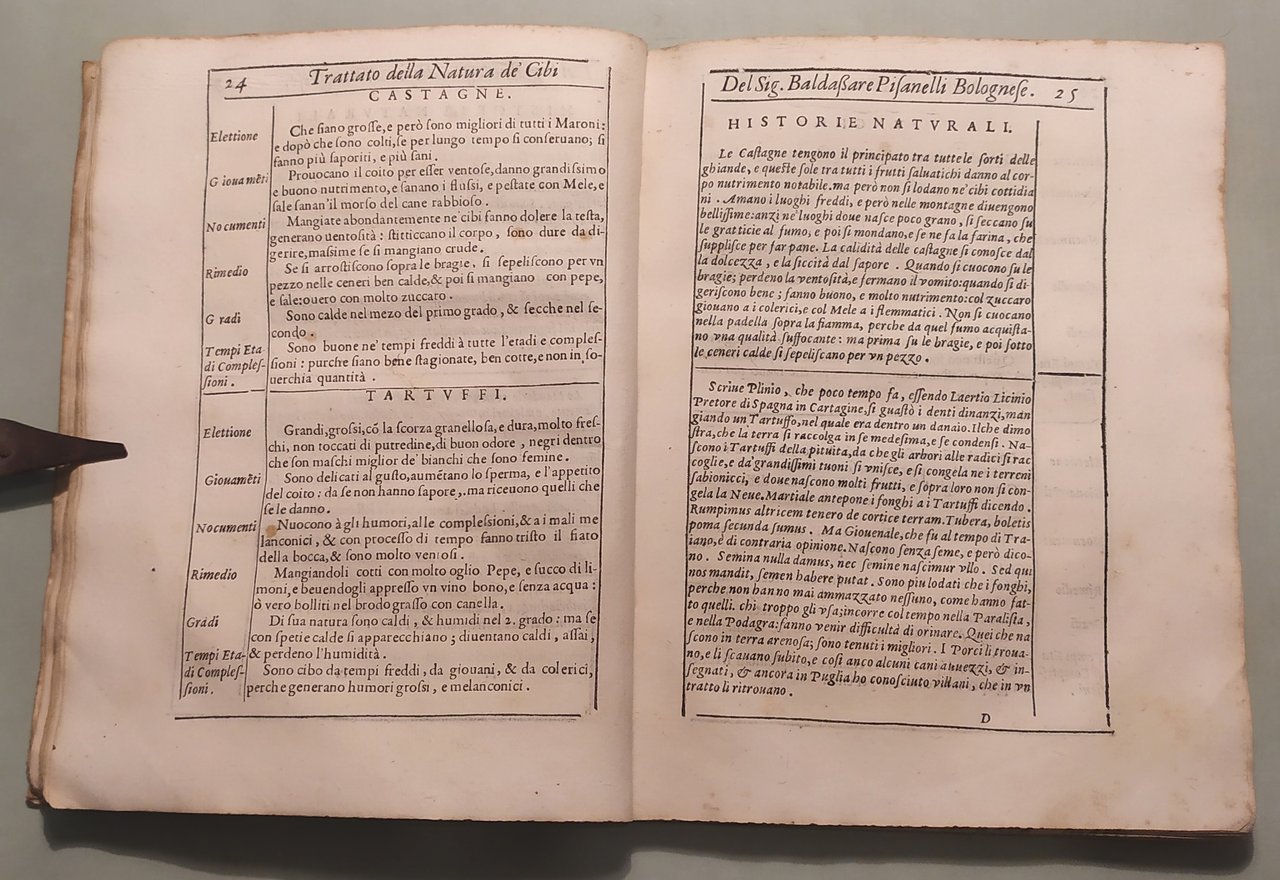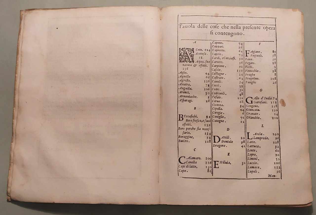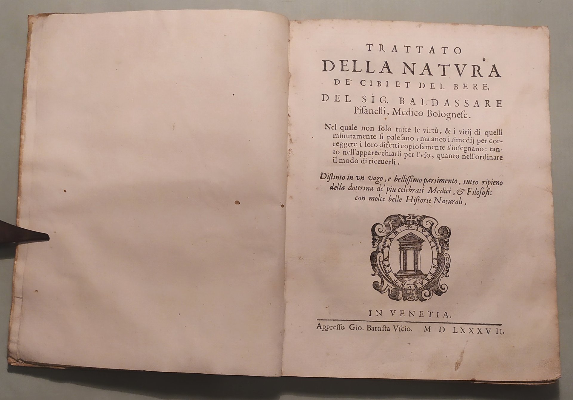 Nel quale non solo tutte le virtù, & i vitii di quelli minutamente si palesano, ma anco i rimedij per correggere i loro difetti copiosamente s’insegnano: tanto nell’apparecchiarli per l’uso, quanto nell’ordinare il modo di riceverli. Distinto in un vago e bellissimo partimento tutto ripieno della dottrina de' più celebrati Medici & Filosofi con molte belle Historie Naturali. In Venetia, appresso Gio. Battista Uscio, 1587. In 8vo; cc.4n.nn., pp.162 (ma 152). Errori nella numerazione, ma esemplare completo. Insegna tipografica al frontespizio, testo inquadrato. Pergamena coeva, titolo calligrafato al dorso. Disamina accurata delle virtù e difetti dei più comuni cibi, frutti e liquori. Insegnamenti per la preparazione e la cottura. Consigli per la scelta degli alimenti. Di ogni cibo è riportata la storia e la considerazione di esso presso antichi medici. Paleari Henssler, 1414; Westbury pag. 174; Bitting, pag. 372; Testimonianze di storia alimentare nei fondi archivistici e librari dell’Università di Perugia: “Il Trattato di Baldassarre Pisanelli (medico a Bologna e Roma, †1587) ebbe grande fortuna tra XV e XVII secolo per la semplice struttura e la facile consultazione. Dedicato a Guglielmo Gonzaga, duca di Mantova e di Monferrato, il trattato di dietetica contiene consigli di buone pratiche alimentari e prende in considerazione i cibi presenti sulle tavole dei signori (frutta, ortaggi, erbe aromatiche, cereali e legumi, carne, pesce, latte e derivati, vino). Di ogni alimento vengono indicate le caratteristiche principali (elettione), i giovamenti, i nocimenti, i rimedi, i gradi, i tempi migliori (eta di complessioni) per la sua assunzione; a questo Pisanelli aggiunge nelle pagine di destra una breve historia naturalis dell’alimento, con notizie curiose sull’uso dei cibi. Colpiscono le considerazioni ispirate a una concezione gerarchica della società: la trippa è cibo per persone che faticano, le pernici giovani non nuocciono se non a gente rustica. Il porco (p. 66) nuoce alle persone delicate e che vivono nell’ozio, ma è adatto alle persone che s'affaticano molto; la maniera migliore per mangiarlo è arrosto con spezie. Le porchette (p. 68) che si mangiano con tanta curiosità si devono fuggire perché apportano grande danno, ma se il porco sarà di età consistente sarà di ottimo nutrimento. I prosciutti e i salami risvegliano l’appetito ma bisogna mangiarne con moderazione. (SB)"