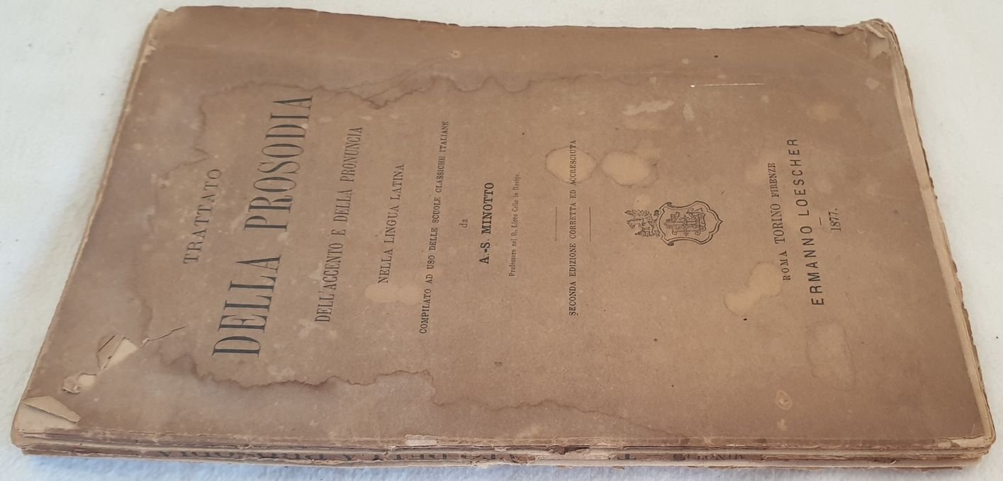 Edizione Loescher del 1877 di questo breve tratatto di prosodia, accento e pronuncia di Minotto. Firma al frontespizio. In discrete condizioni. Copertina editoriale in discrete condizioni generali con usure ai margini e dorso. Legatura in discrete condizioni con rotture. Pagine in discrete condizioni con fioriture e gore d'umidità marginali. In 8. cm 20,5x14. Pp. 85+(3) Loescher edition of 1877 of this breaf treaty of prosody, accent and pronounciation by Minotto. Signature in title page. In fair conditions. Editorial cover in fair conditions lightly worn in the extremities. Binding in fair condition with cracks. Pages in fair conditions with foxing and light dump stains. In 8. cm 20,5x14. Pp. 85+(3)