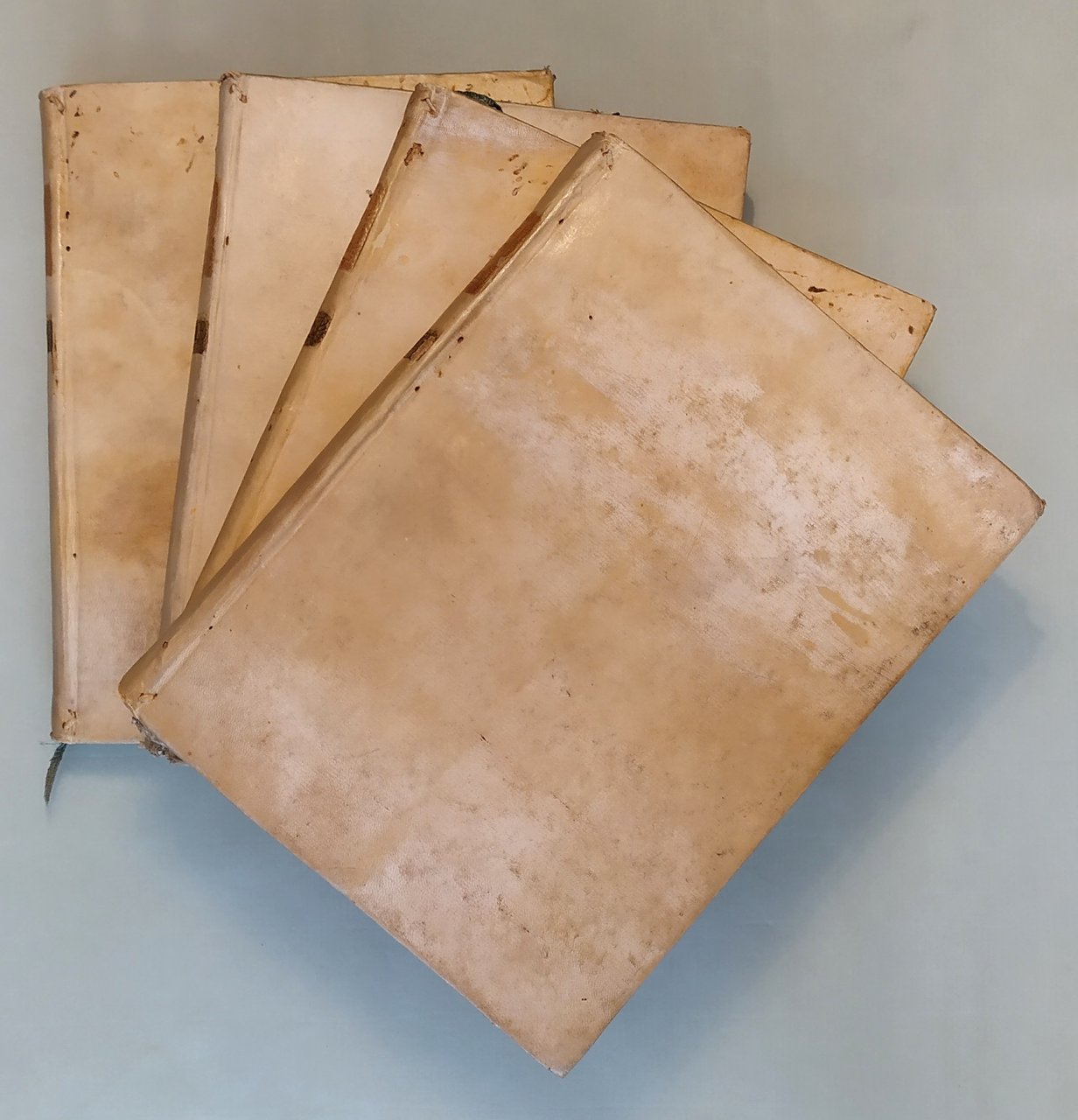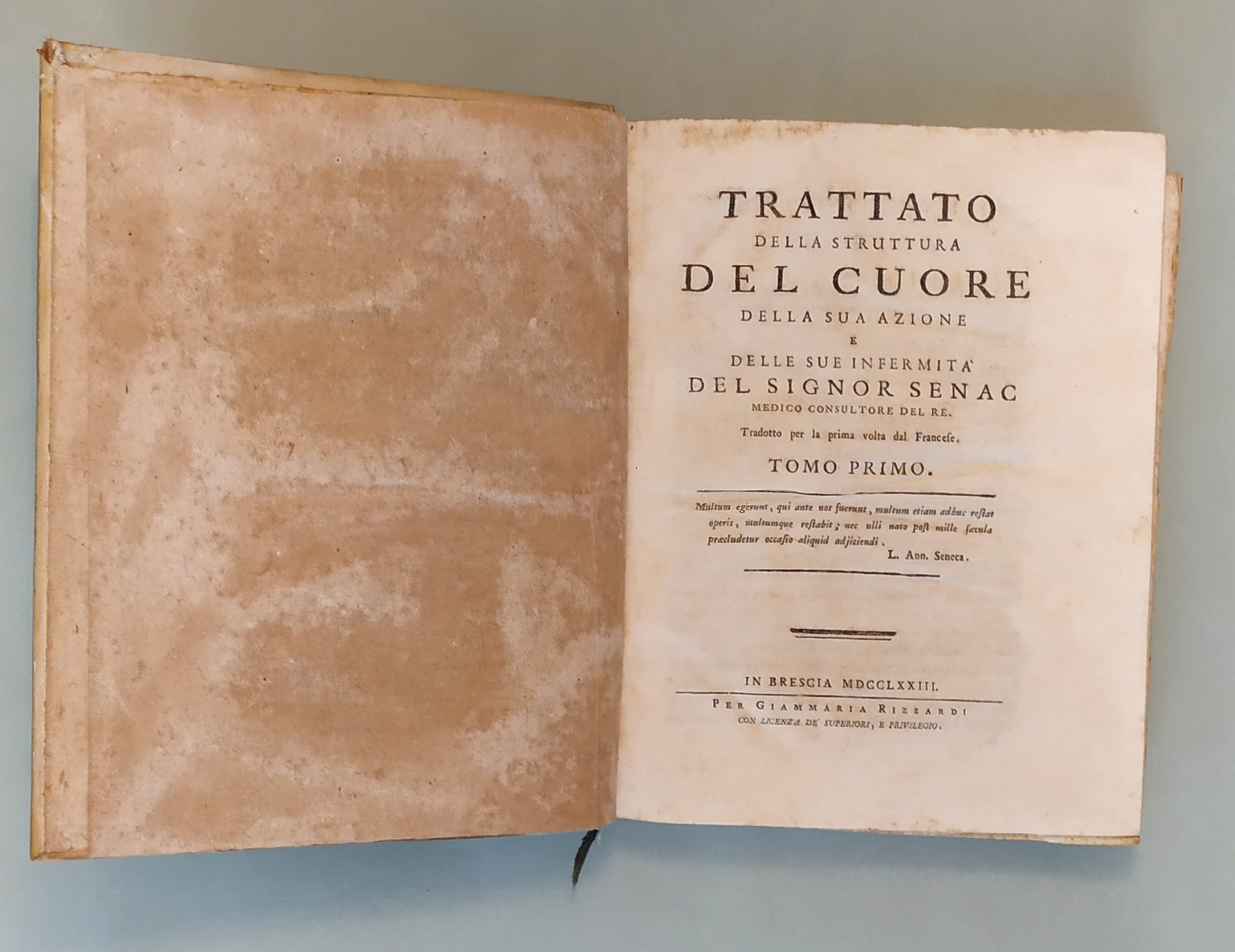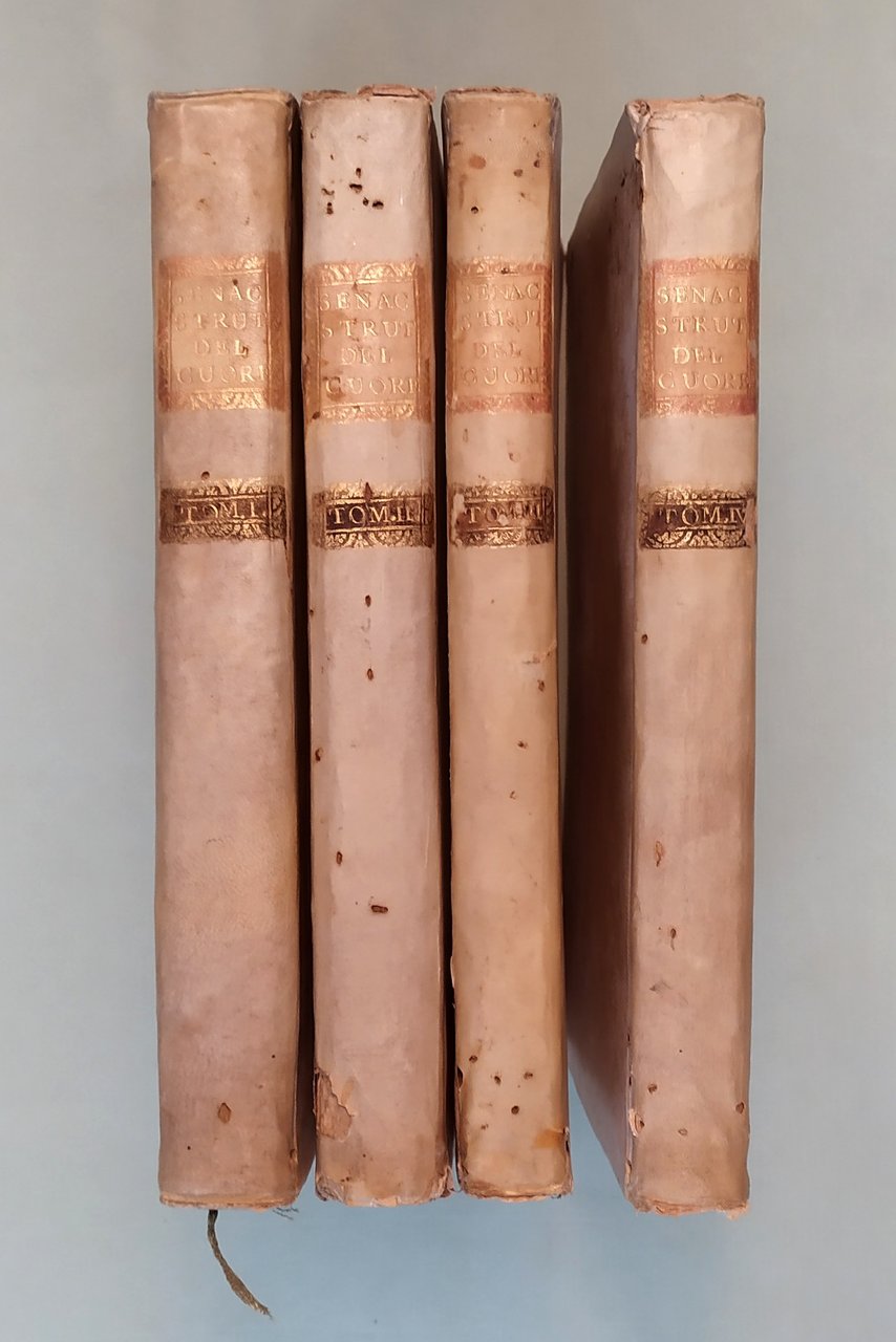 In Brescia, Rizzardi, 1773. Quattro volumi in 8vo; pp.XLIII,1 carta bianca, 287, stemma al verso dell’ultima pagina e 17 tavole spieghevoli in fine, la tavola 7 ripetuta due volte; 368; 275; 340. Pergamena coeva, doppio tassello ai dorsi con titolo e fregi in oro. Prima edizione italiana. Blake 414; Garrison Morton, 2733 per l’edizione originale del 1749.