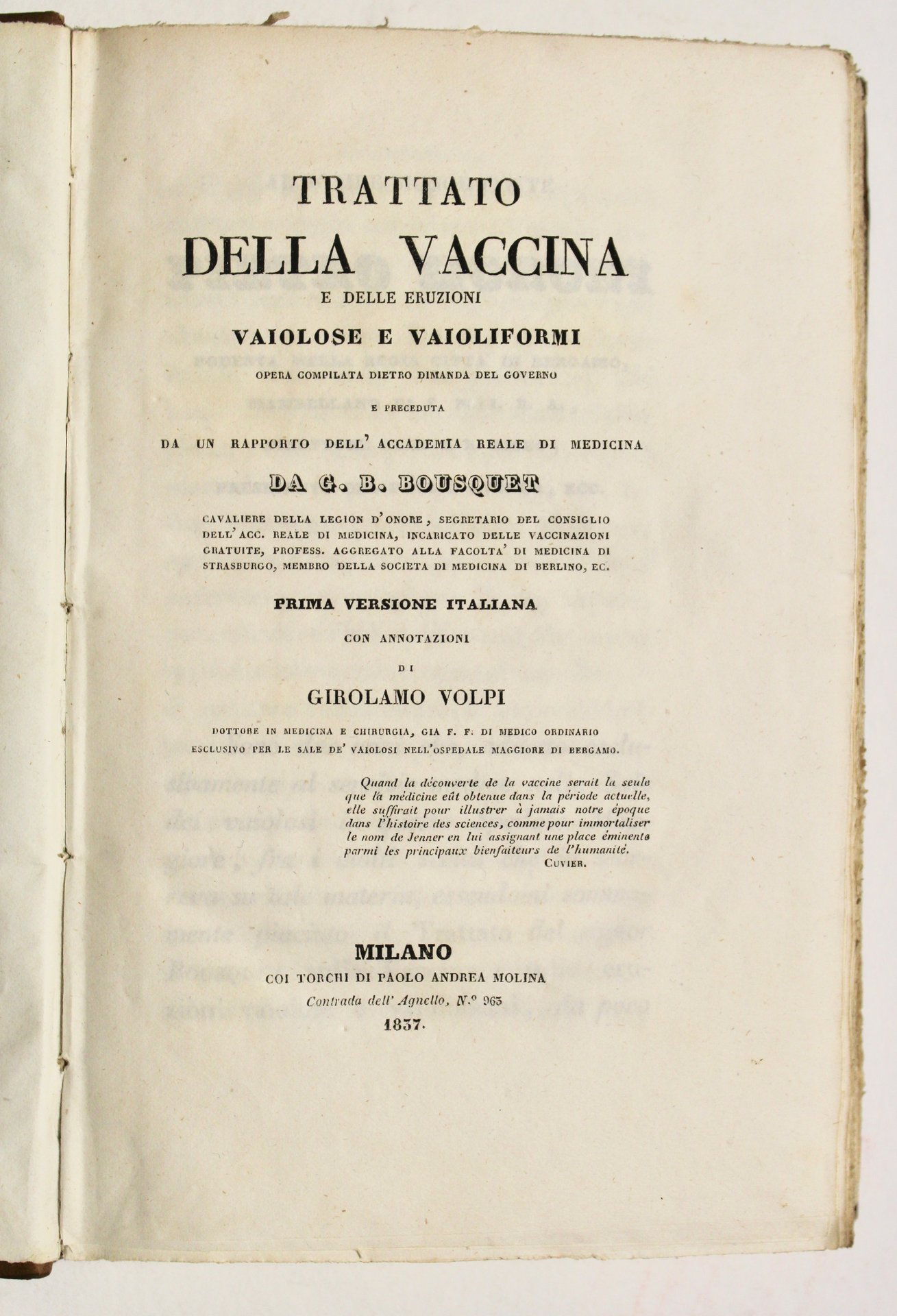 In 8° (mm232x147); pagg. XXXVI; 329. Elegante mezza pelle di vitello coeva, titoli su tasselli arancio e verde, ramages, filetti e fregi a piccoli ferri impressi in oro al dorso. Prima edizione italiana, nella quale l'emerito medico Bousquet, Jean Baptiste, 1794-1872 , cavaliere della Legion d'onore segr. Del consiglio dell'acc. Reale di Medicina…professore dell'università di Strasburgo.ecc; tratta del flagello del vaiolo, dalla scoperta all'uso della vaccinazione di cui egli personalmente si occupò. Con un supplemento sulle congetture sulla storia della vaccinazione. Discorso dell'accademia dei Lincei di Roma…1824. Ottimo esemplare in barbe